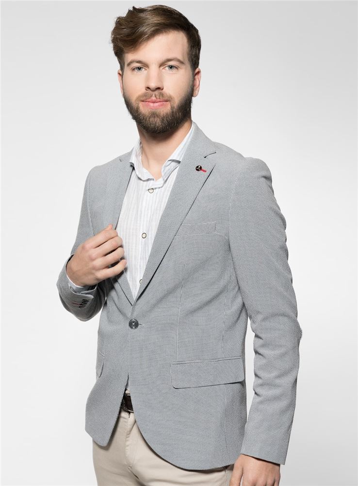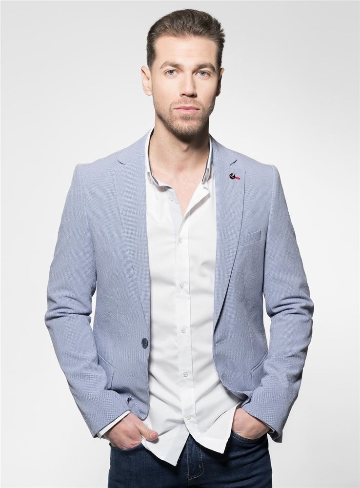Prenda de tipo sport realizada en patron Custom Fit, con cierre de un solo botón, bolsillos con tapeta y dos aberturas traseras.