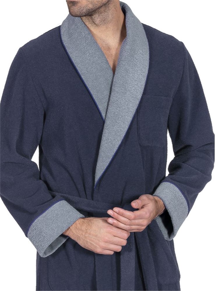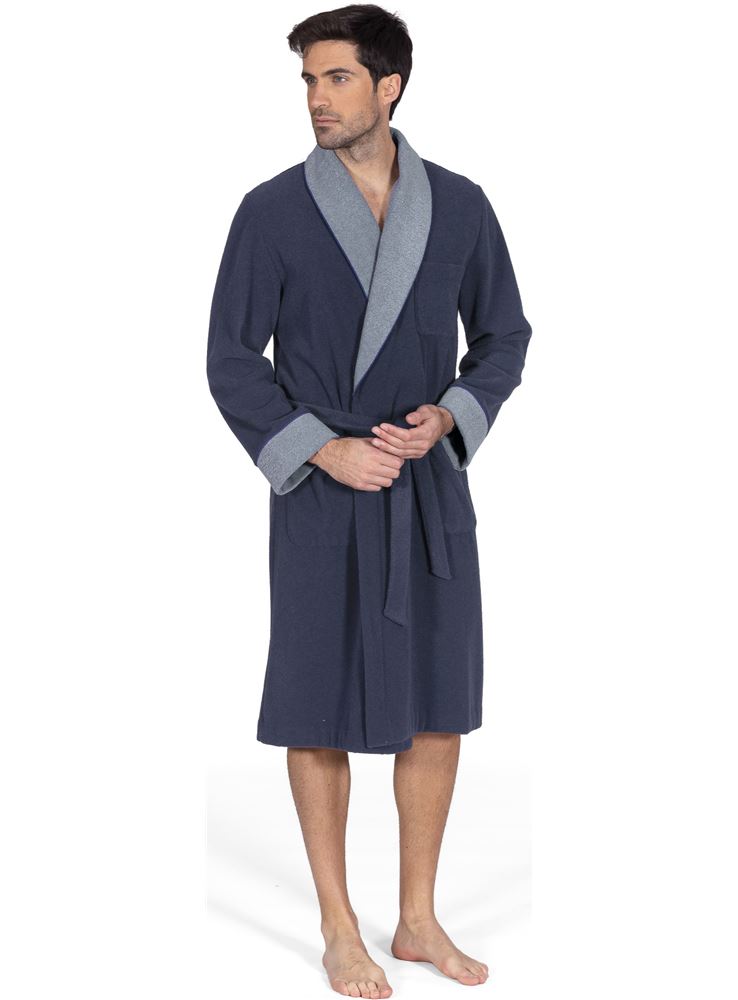 Bata larga de hombre confeccionada en cálido y agradable tejido de rizo, con cuello smoking, cinturón y bolsillos de plastón en las caderas y otro mas en el pecho. Detalle de ribete en cuello y puños.