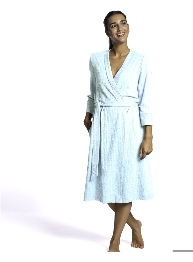 Bata cruzada de manga francesa con tejido de piqué de raya arrugada, de la firma Egatex.