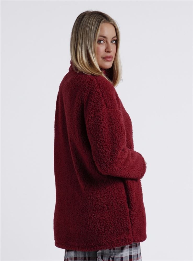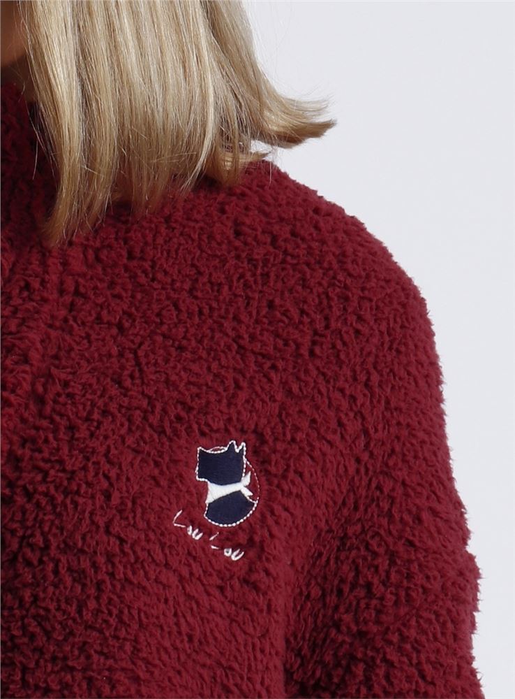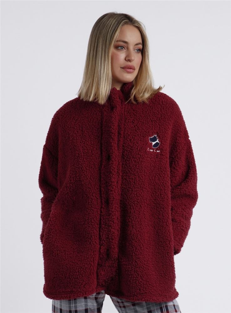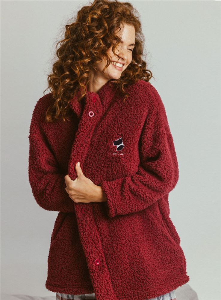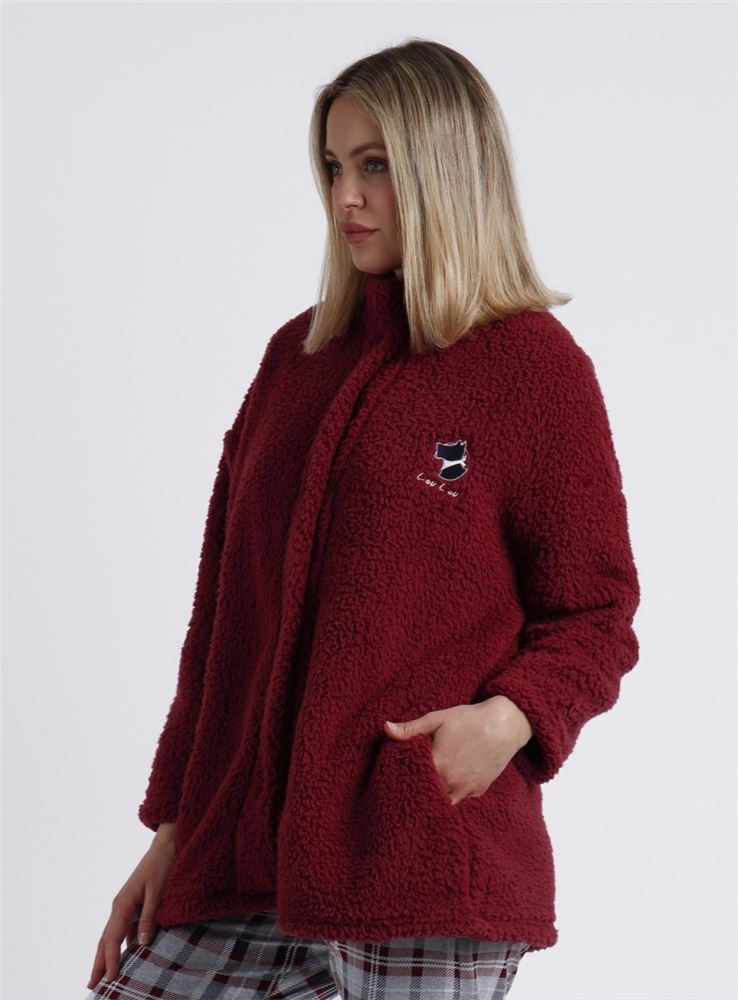 Bata en tejido de borreguito, de color rojo, muy cálido y agradable, con cuello alto, cierre de botones y bolsillos. Detalle de bordado en el pecho con logo y leyenda "Lou Lou"