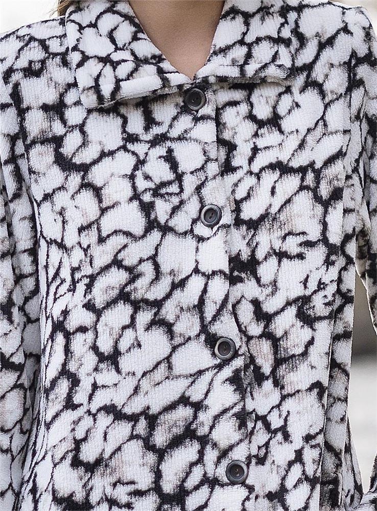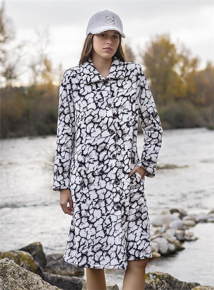 Confortable bata de mujer de largo medio, con cuello de solapa y cierre de botones, de dibujo estampado sobre fondo claro, muy confortable y agradable al tacto.