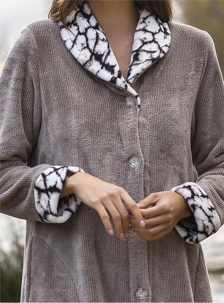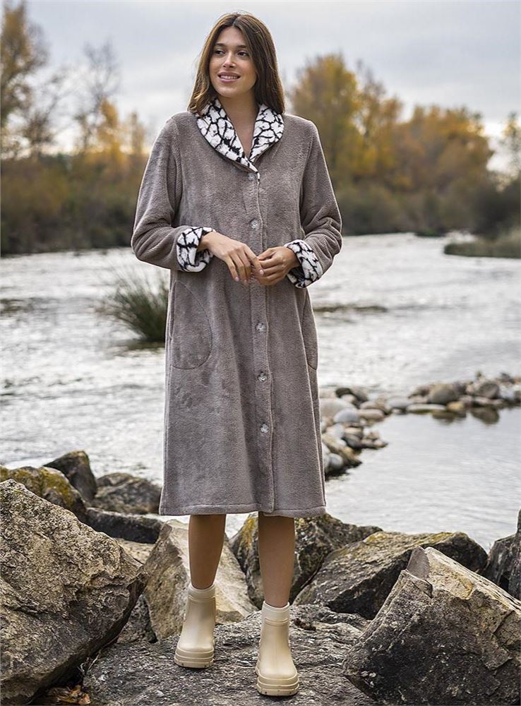 Confortable bata larga de mujer, en cálido y agradable tejido de coral, con cuello smoking y cierre de botones, con fondo liso en canalé, muy agradable al tacto. Parte exterior del cuello y de los puños es tejido estampado.