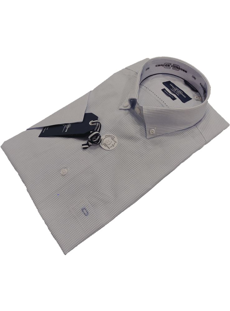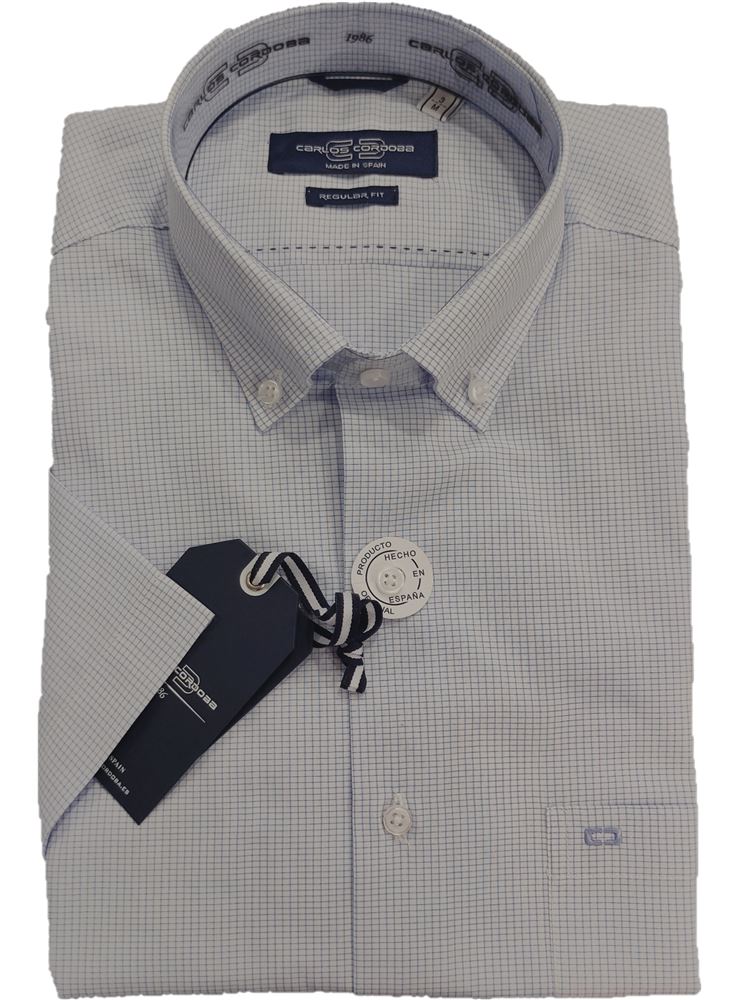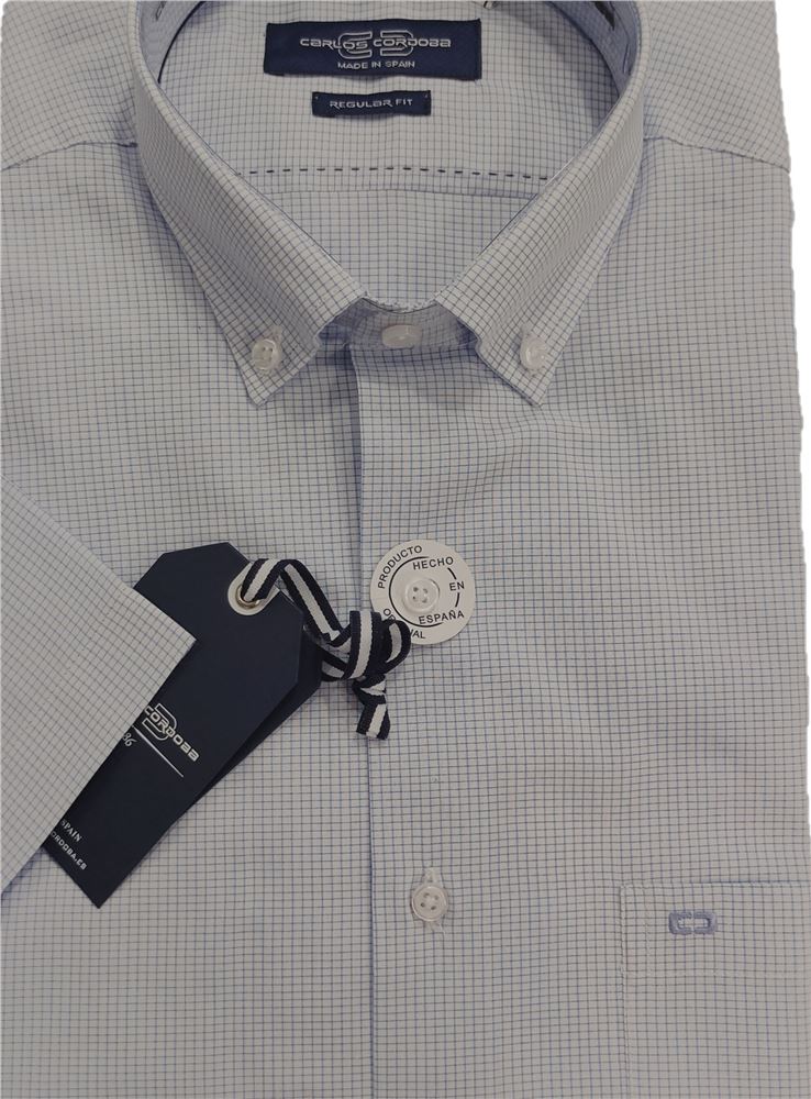 Camisa estampada del fabricante español Carlos Córdoba con dibujo de cuadros azules sobre fondo claro.