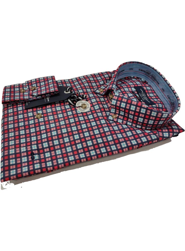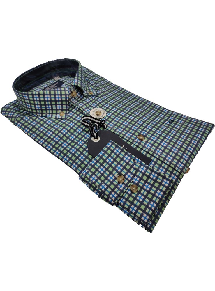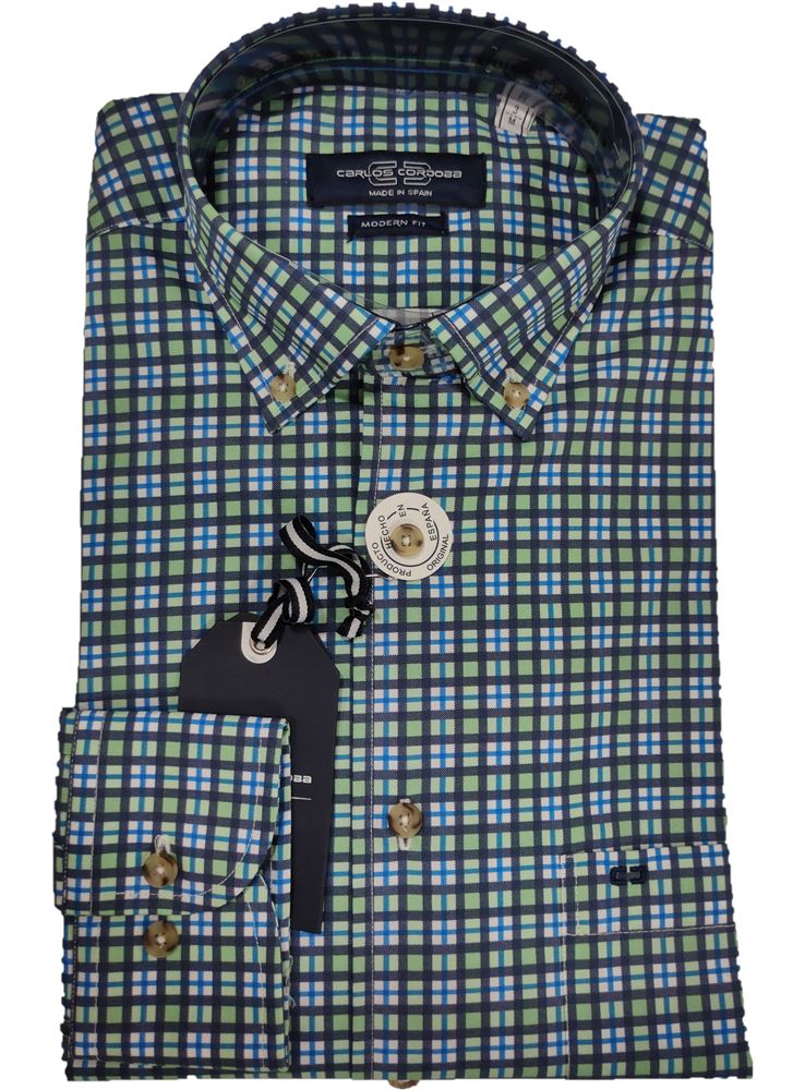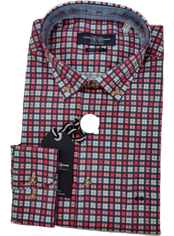 Camisa estampada del fabricante español Carlos Córdoba con dibujo de cuadros sobre fondo claro.