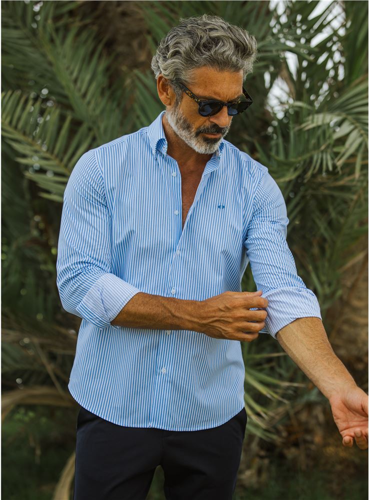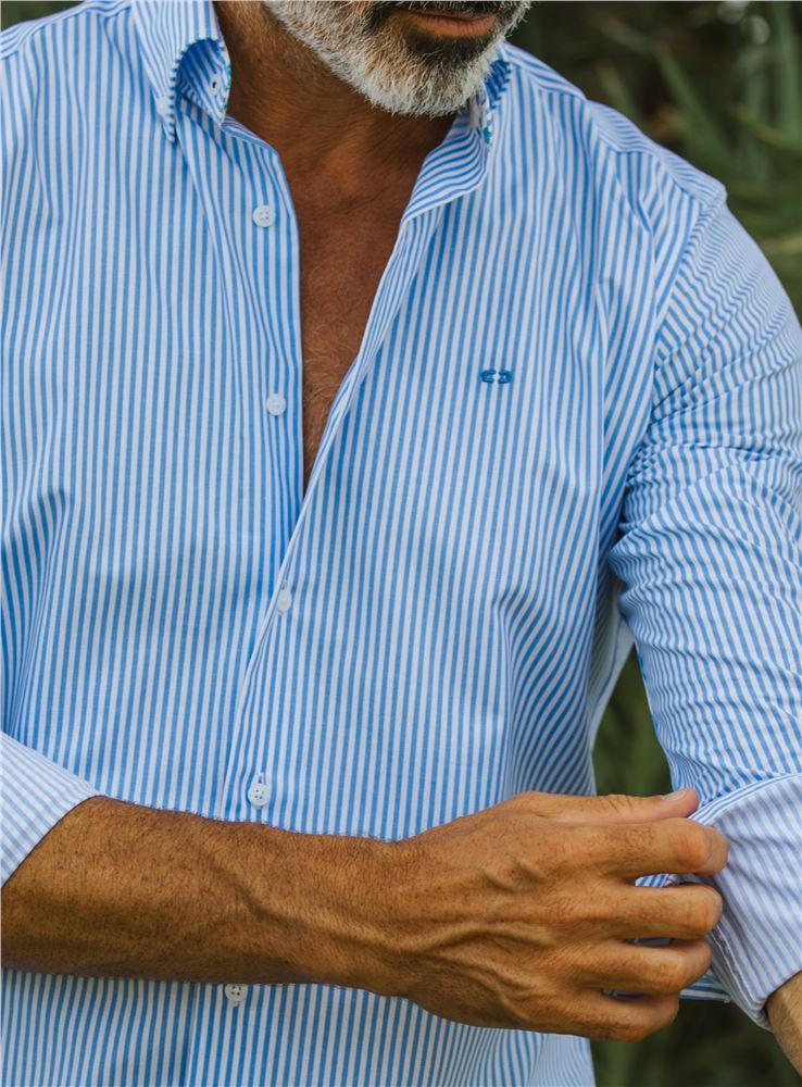 Fabricada en tejido de algodón y poliester con dibujo de rayas, en color azul celeste combinado con raya blanca.