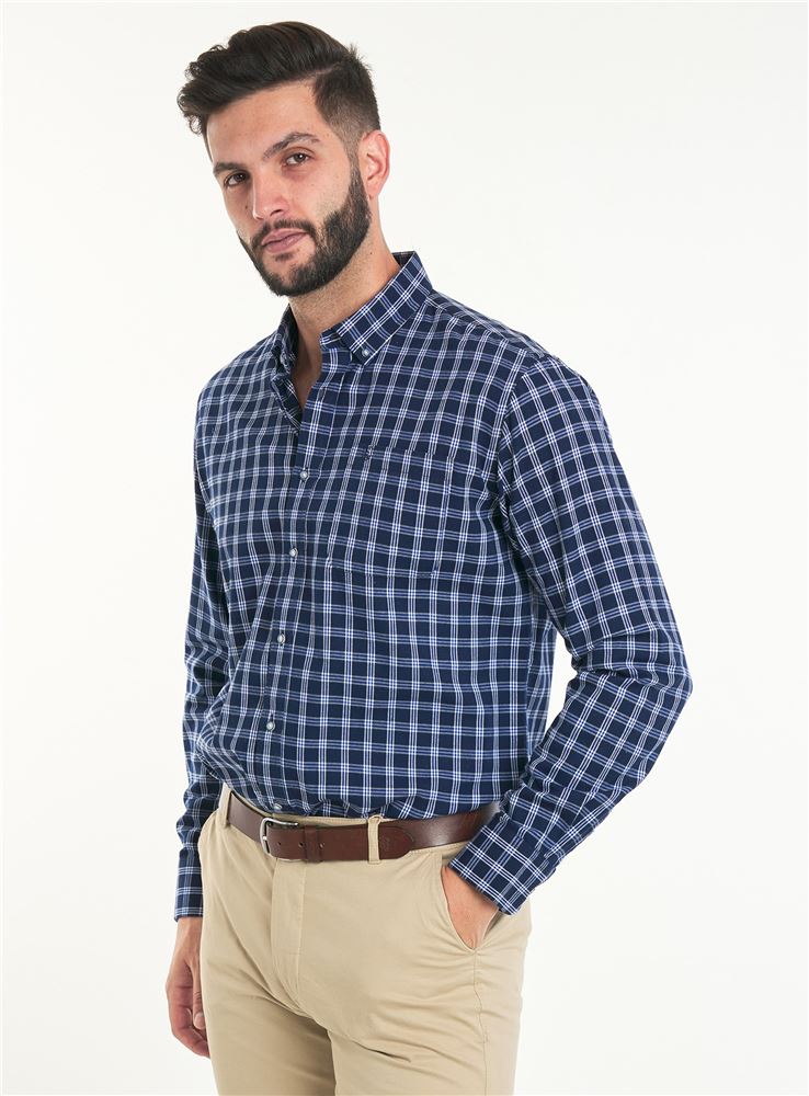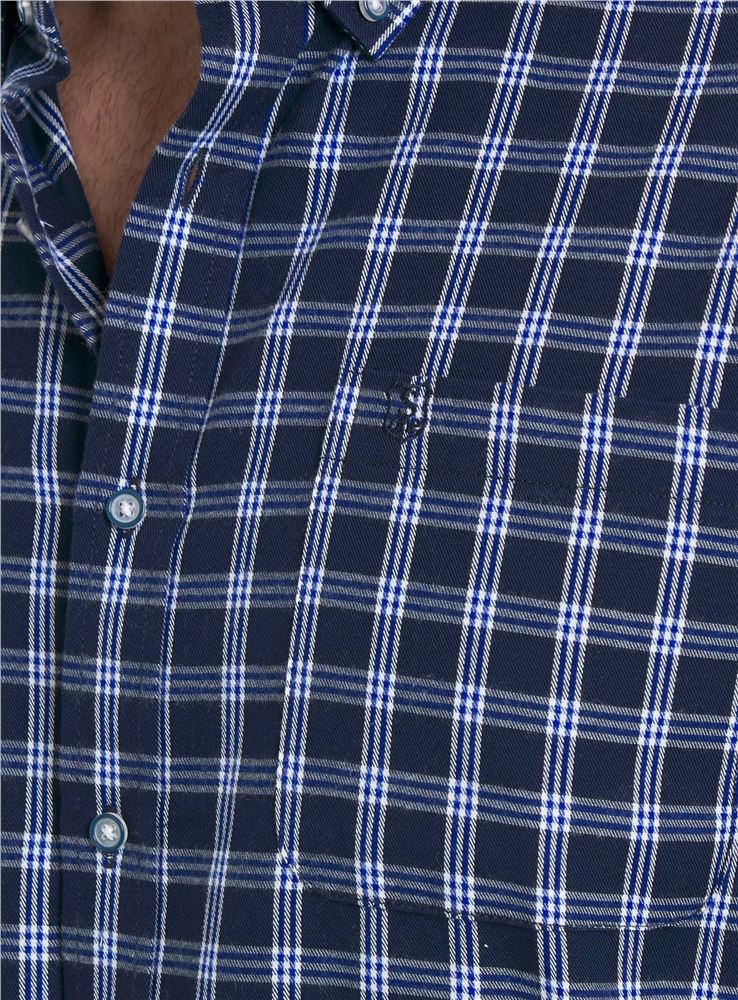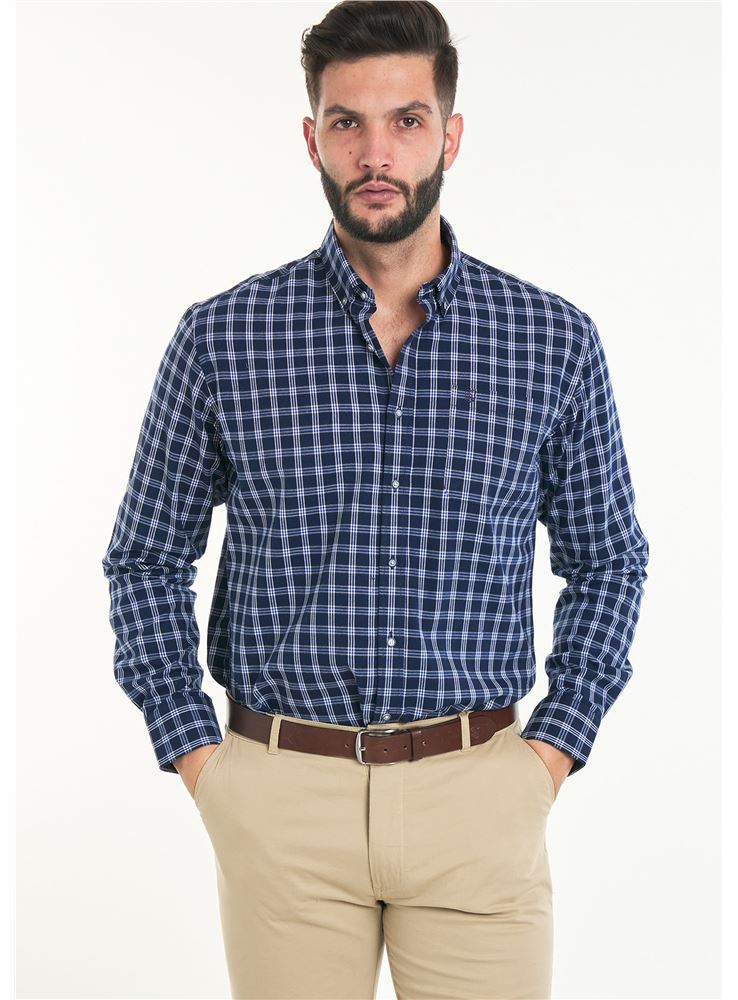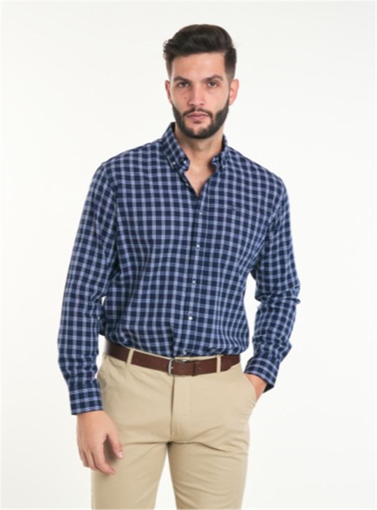Camisa de caballero fabricada en cálido tejido de viyela con dibujo de cuadros en color claro sobre fondo azul marino.
