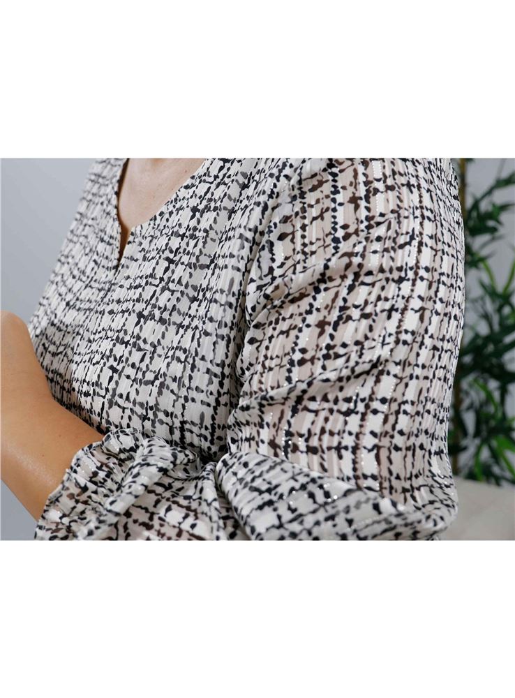 Blusa fabricada en tejido estampado en dibujos de colores negros sobre fondo claro con cuello redondo con pequeño escote a pico, con tejido fruncido y mangas acabadas en puños con volante.