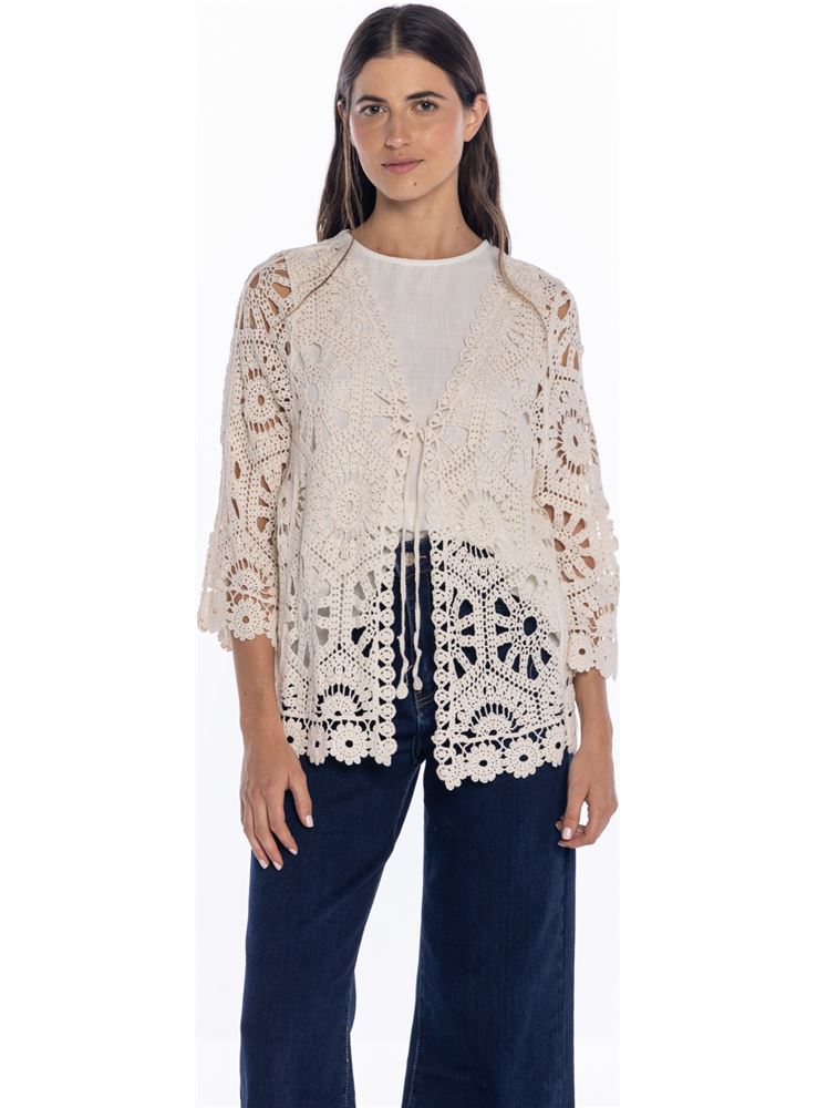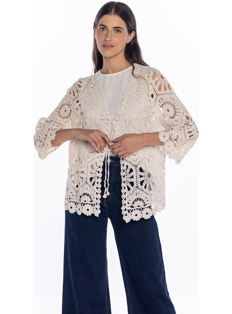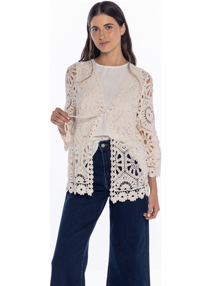 Chaqueta de mujer de encaje, tipo blazer, en color liso crudo, confeccionada con hilo de algodón cordonado. De largo medio, escote a pico, dispone de cordón para abrochar en la parte superior y mangas de largo 3/4.