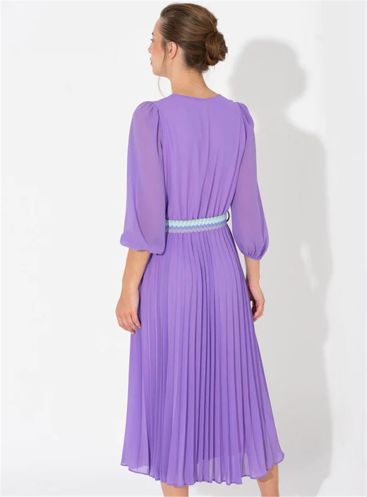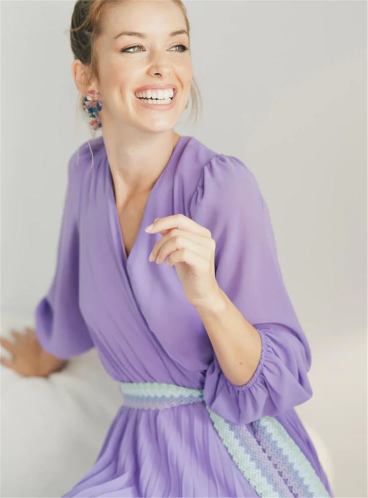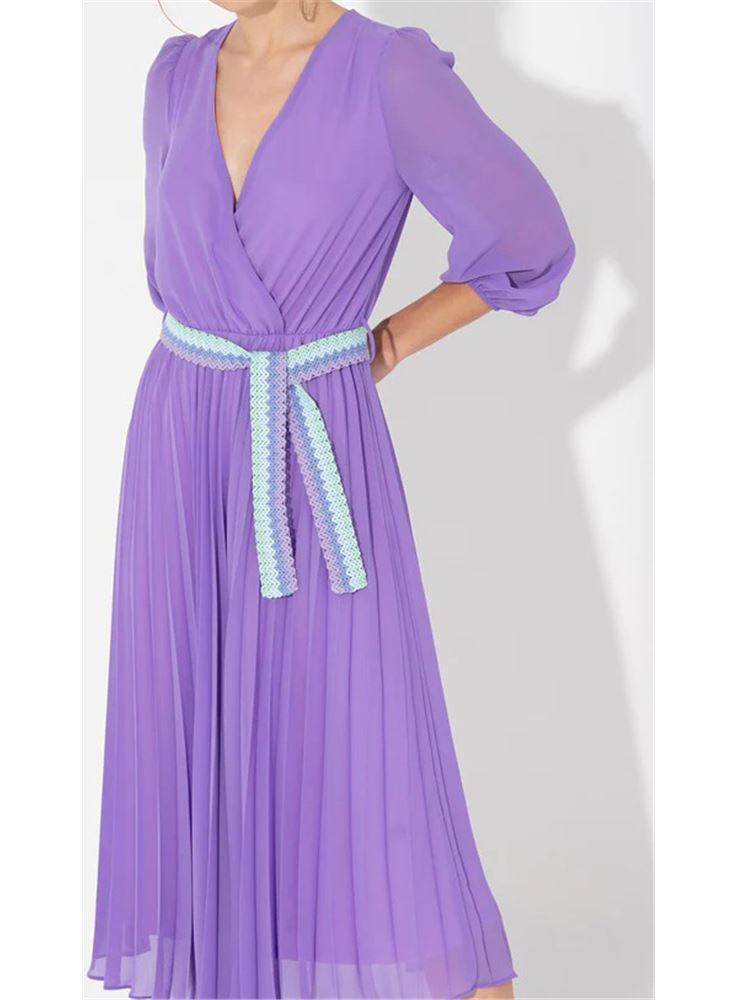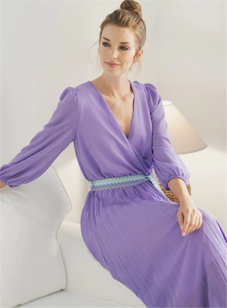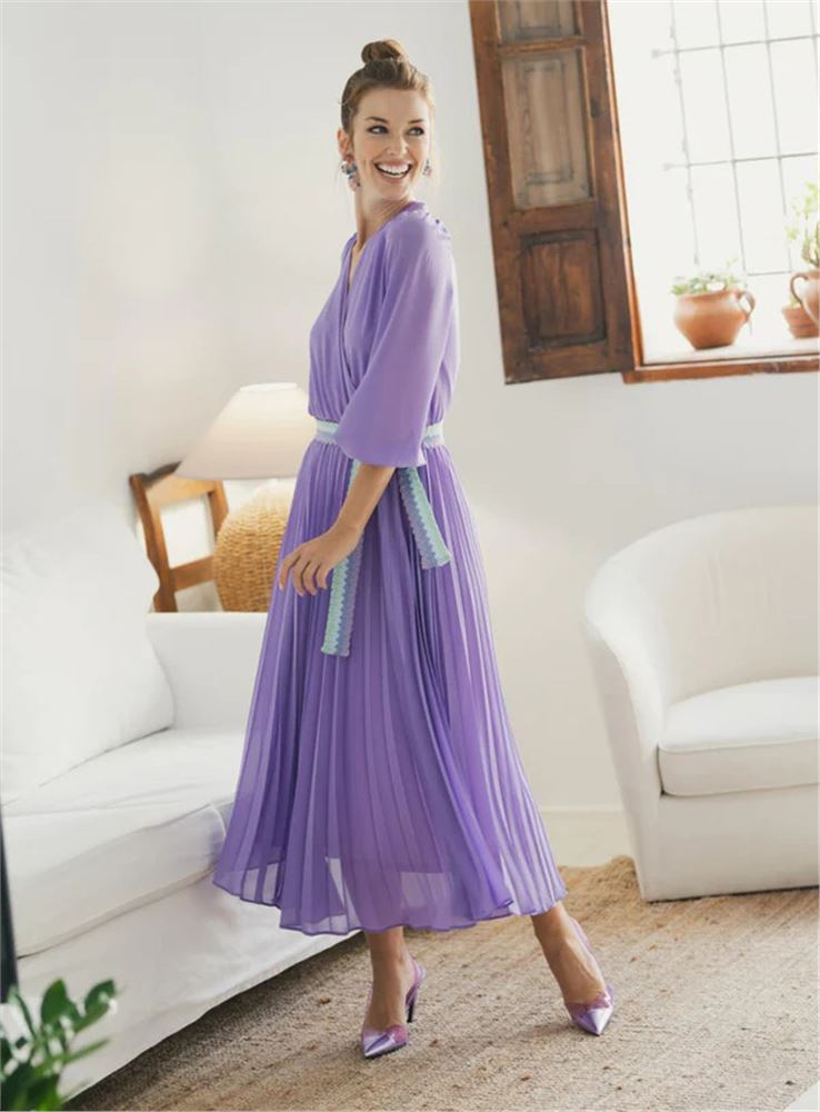 Vestido midi fluido con falda plisada de la marca Tinta Style, disponible en color malva o fucsia.