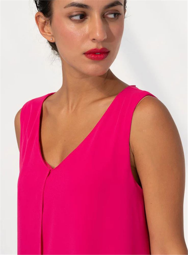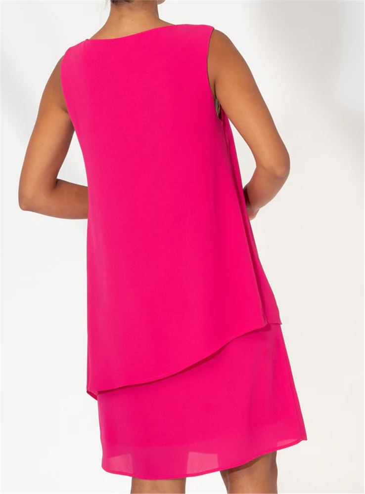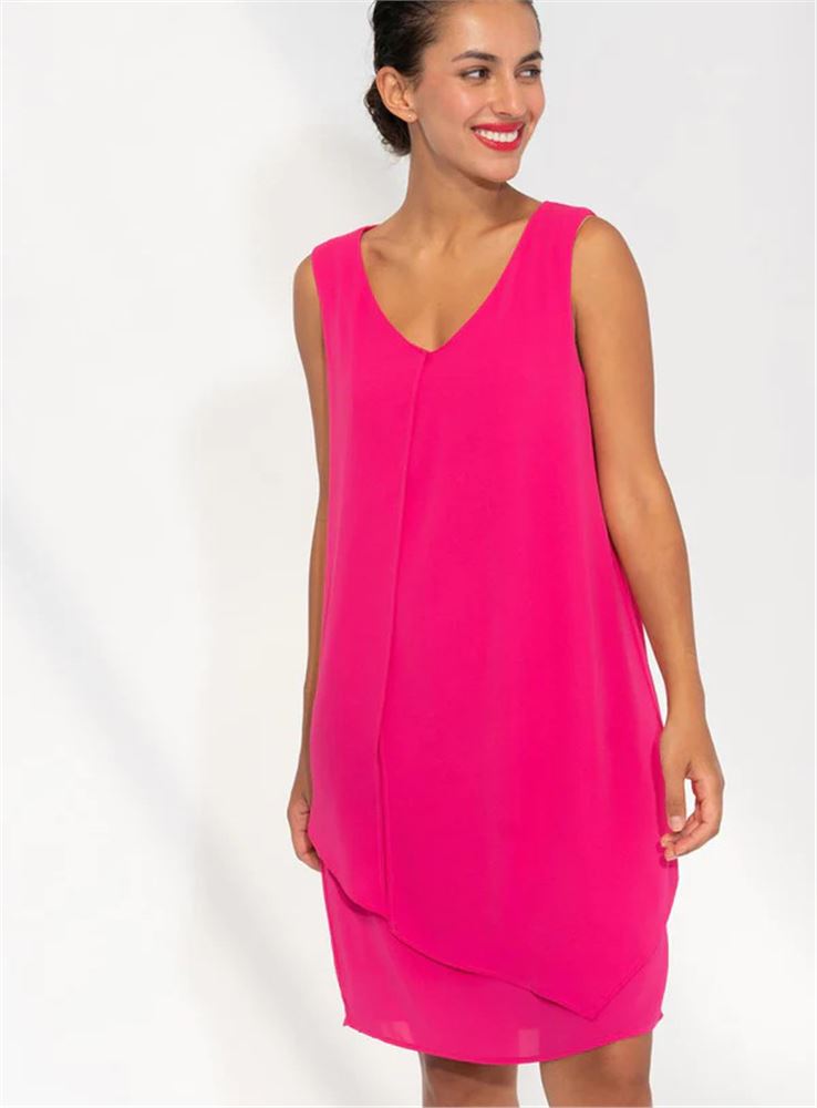Vestido fluido de corte recto con sobre capa asimétrica de la firma Tinta Style, disponible en fucsia o naranja.