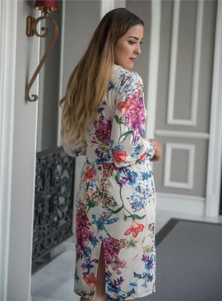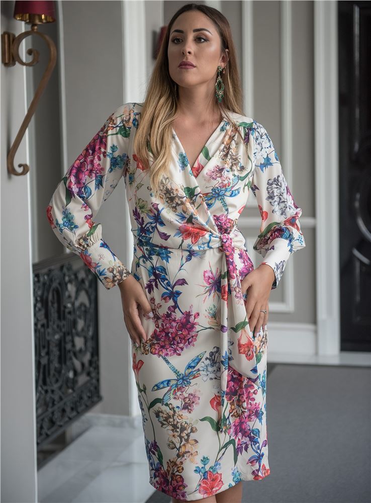 Vestido de fondo crudo con estampado de flores en tonos fucsias, coral y azul. Manga larga abullonada con puño ancho abotonado. Escote cruzado en pico que termina anudado.