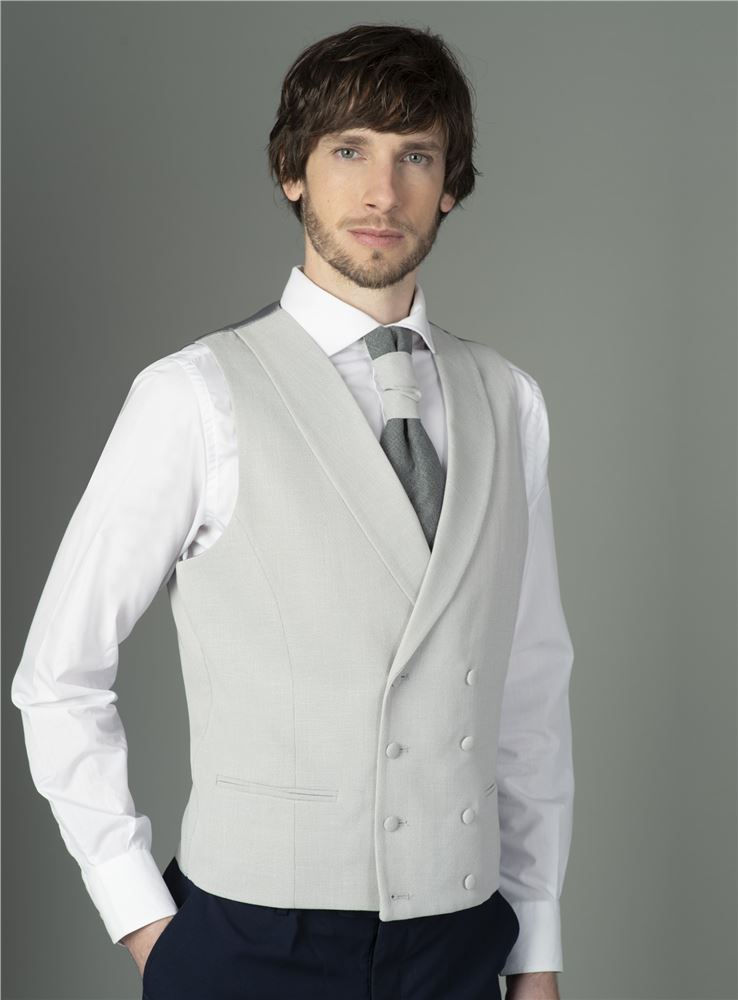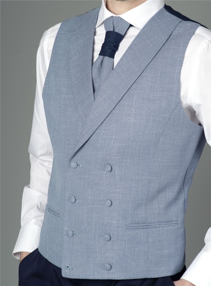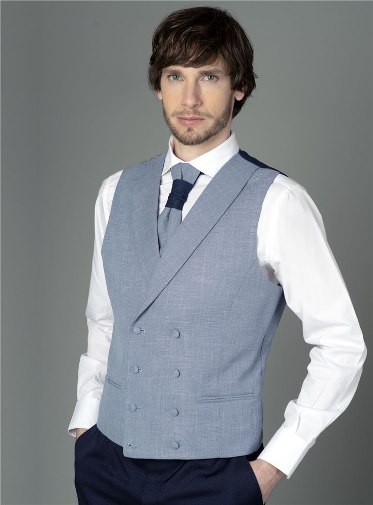 Elegante chaleco cruzado con solapa para traje de caballero confeccionado por la firma Capelhi en colores azul o gris claro.