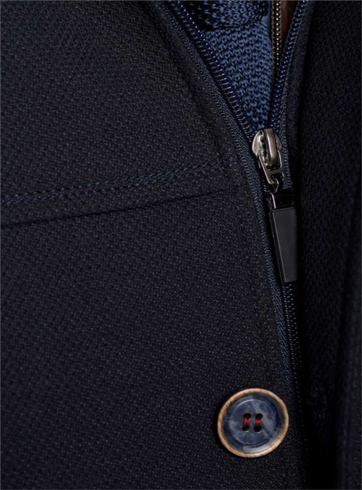 Bolsillos verticales en las caderas y otro más en el lado derecho del pecho, cierre central con cremallera y tapeta con fijación mediante snaps.
