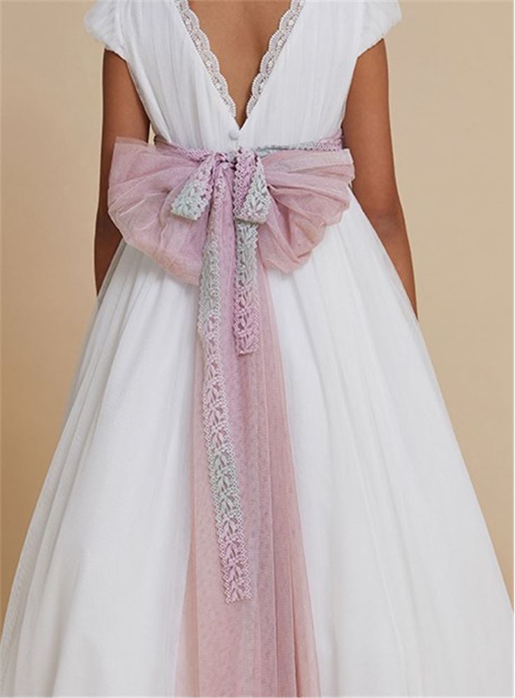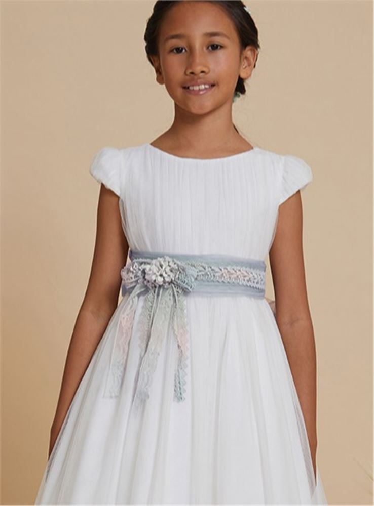Se trata de un fino y elegante adorno floral de cinturón en tonos malvas y verde agua, complementado por encaje y apliques de gasa al tono que realzarán la cintura de cualquier vestido de comunión o ceremonia. Gracias a su tamaño, se puede utilizar solo sobre el vestido o sobre otro cinturón como contraste.