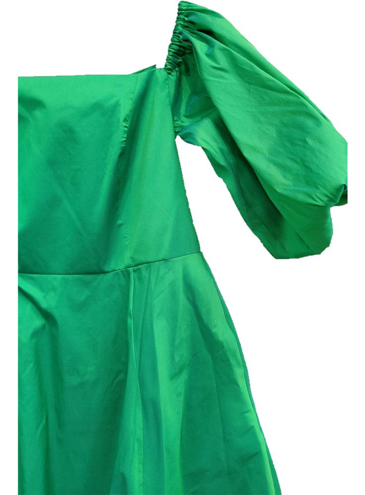 Elegante vestido largo confeccionado en tejido de tafetán, escote palabra de honor con elástico en las mangas.