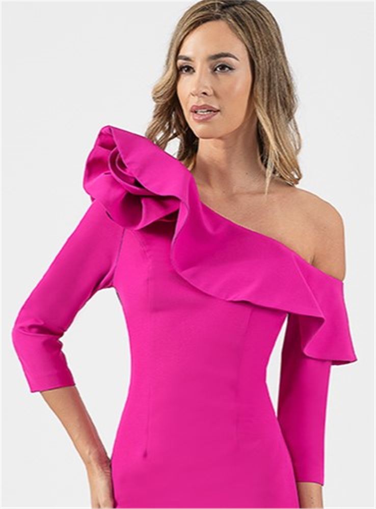 Confeccionado en cuello asimetrico, con volante en todo su contorno y rematado en el hombro con una elegante flor realizada en el mismo tejido.