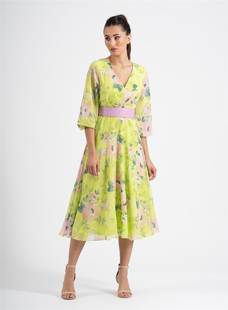 Realizado en largo midi, con cinturón añadido en color malva a juego con las estampaciones.