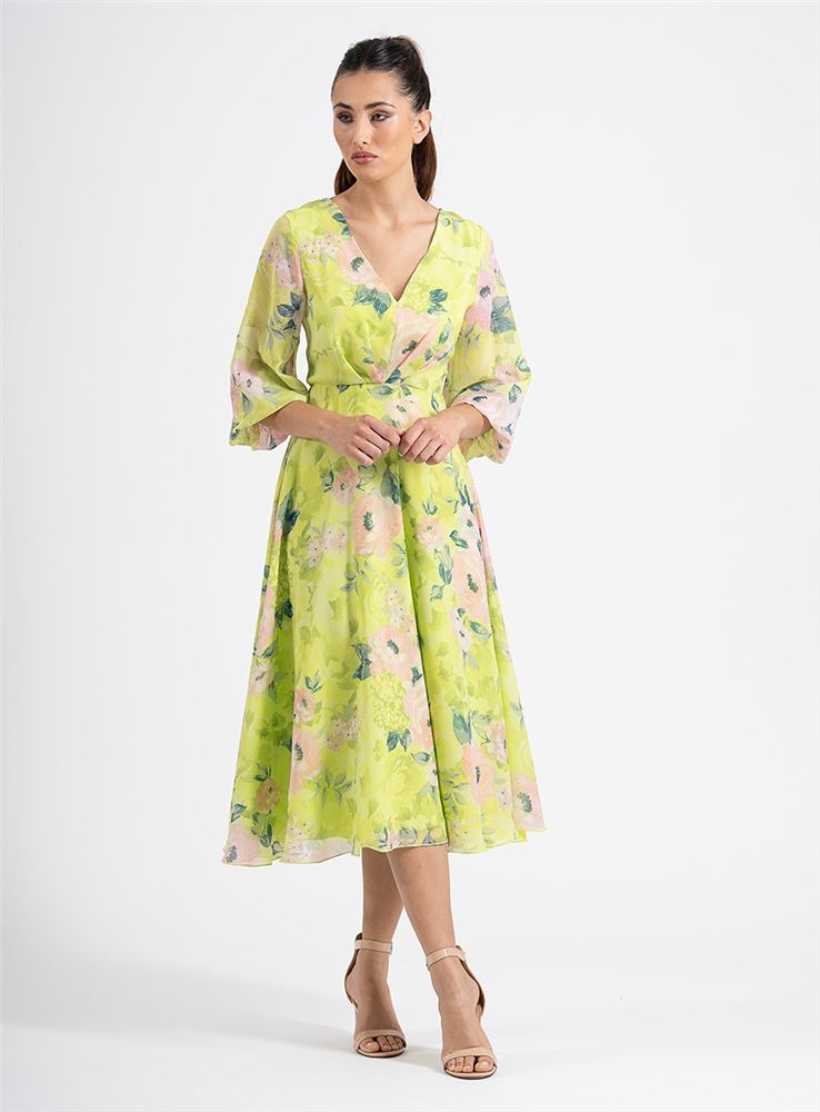 Confeccionado con tejido estampado en motivos florales sobre fondo en color verde lima, en cuello en V, con mangas francesas, en 3/4, del mismo tejido y estampado.