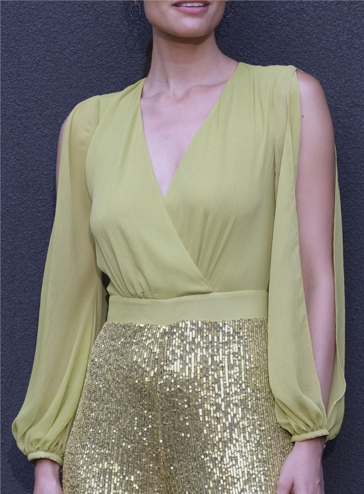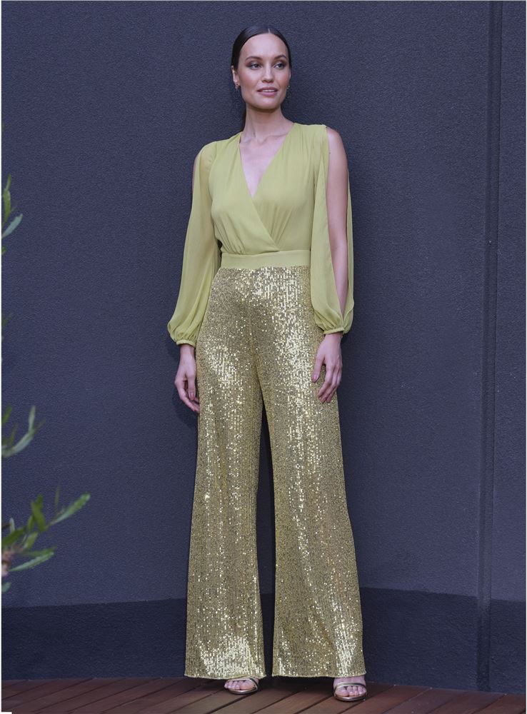 Pantalon elaborado en tejido de lentejuelas al tono con la parte superior, ambos en color verde lima.