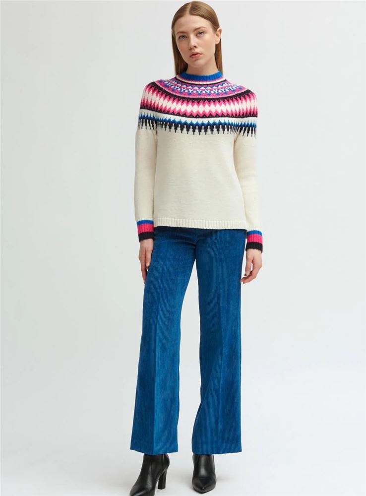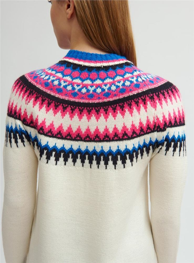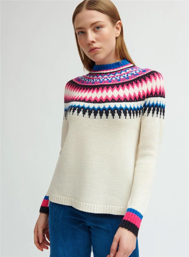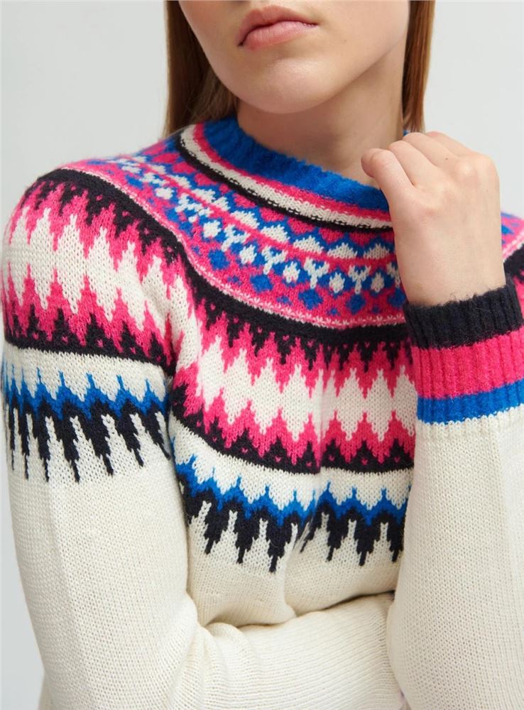 Jersey de punto en fondo de color natural con dibujos geometricos multicolores.