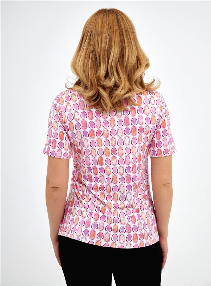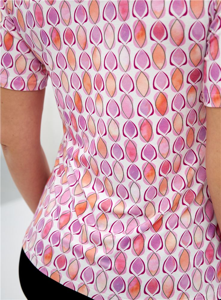 Confeccionado en tejido estampado, con dibujo geometrico donde predominan los colores rosados sobre fondo claro.