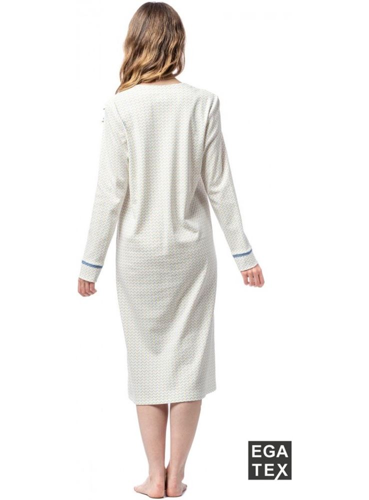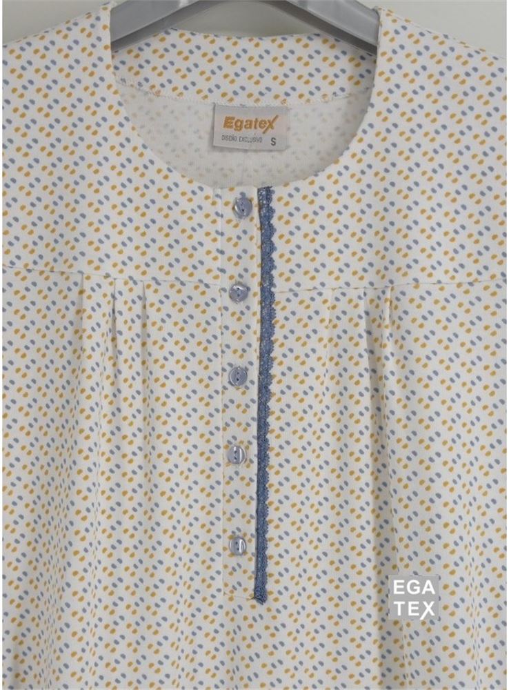 Cómoda camisola de mujer en tejido de algodón, con tapeta y estampado de lunares en tonos azules y amarillos sobre fondo crudo.