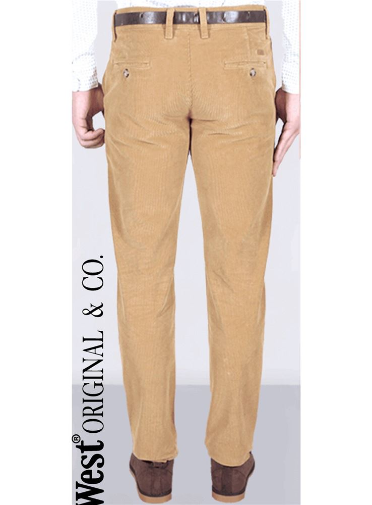 Pantalón de caballero de la firma West. Pantalón de corte chino con pana elástica. Bolsillo francés. Pierna estrecha. Composición 98% algodón, 2% elastano lo que le de mayor comodidad. Disponible en color Camel, Beig y Azul Marino. Fabricado en España.