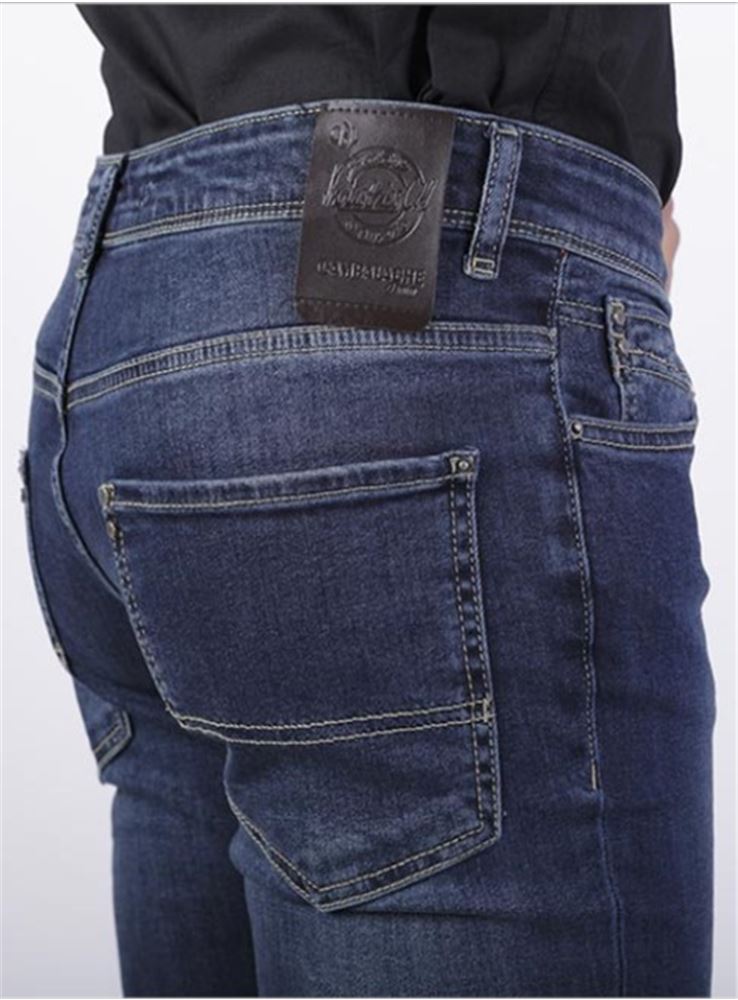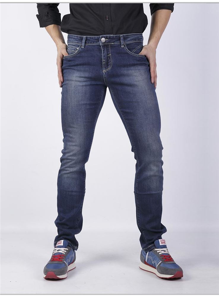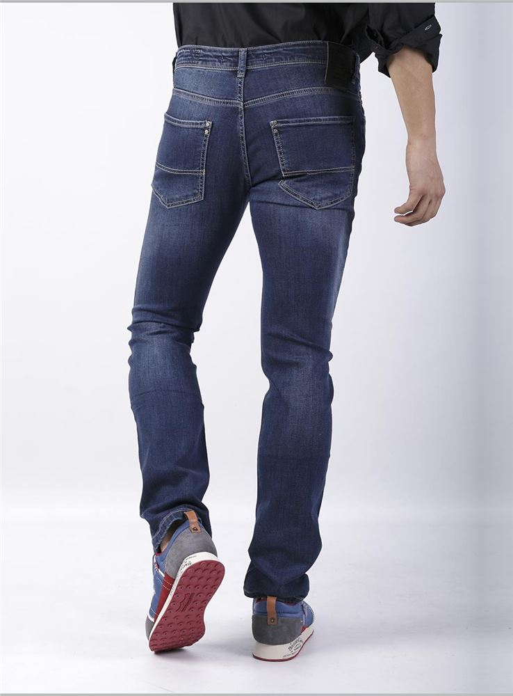 Pantalon denim slim de corte recto en color azul oscuro, un cinco bolsillos para incluir en tus estilismos esta temporada.