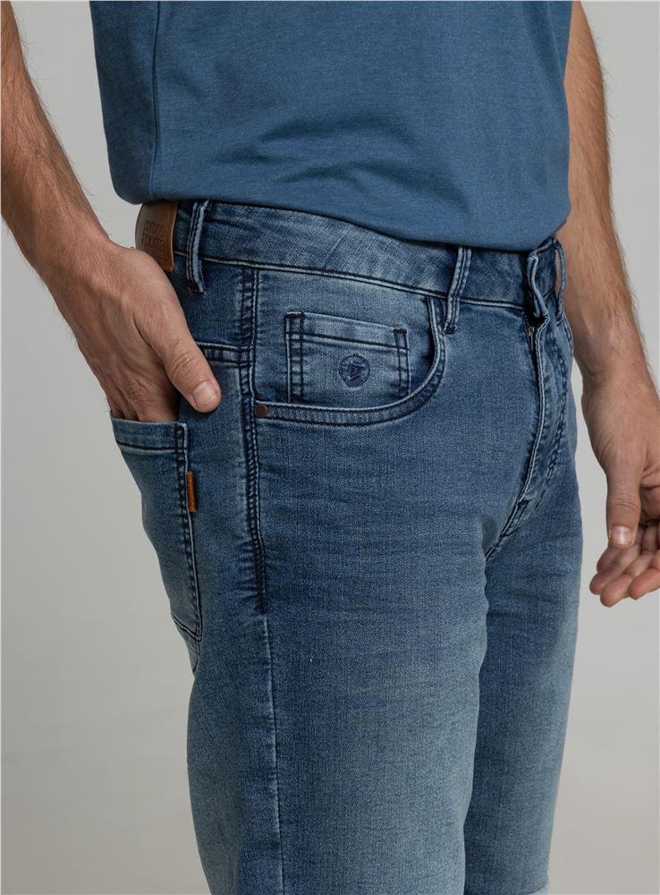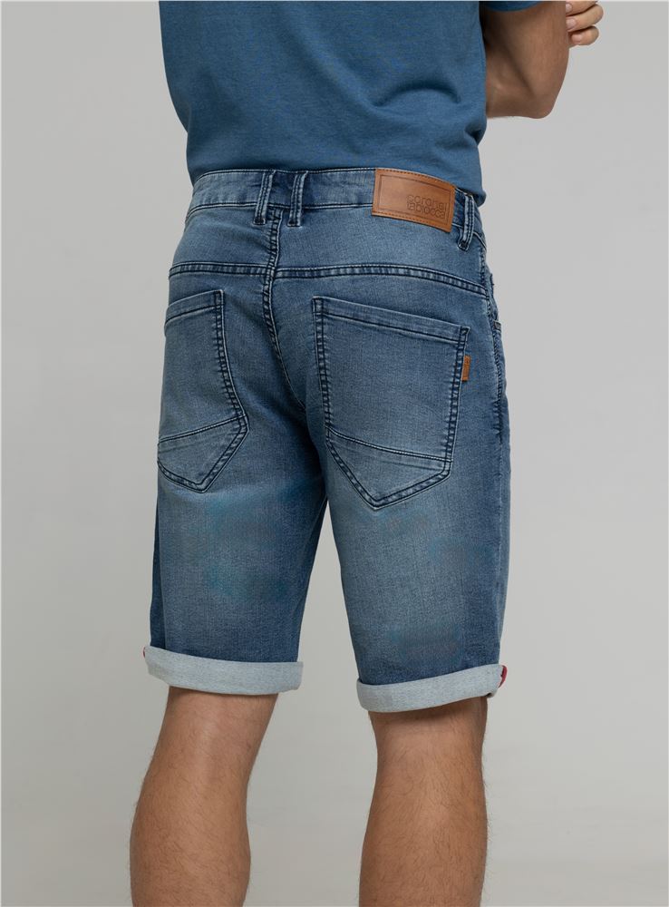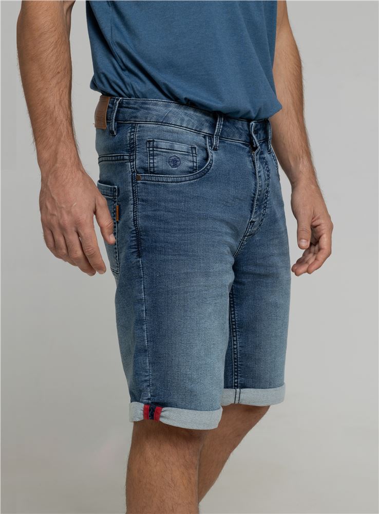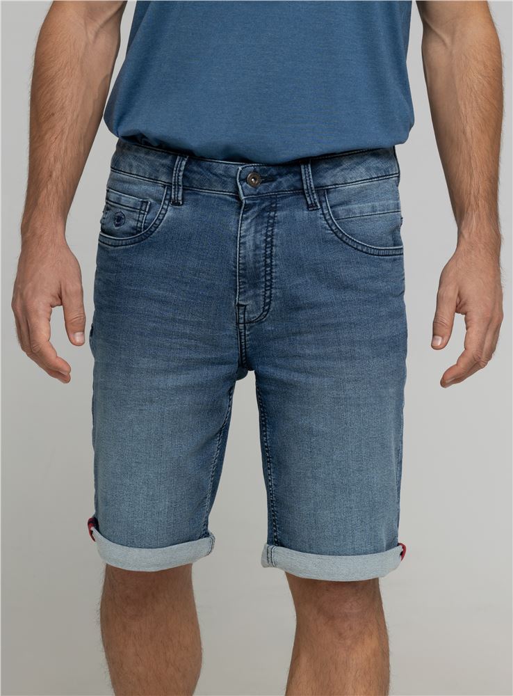 Bermuda de caballero en tejido vaqeuro elástico, de patrón Medium Fit, con cinco bolsillos y bajo vuelto.