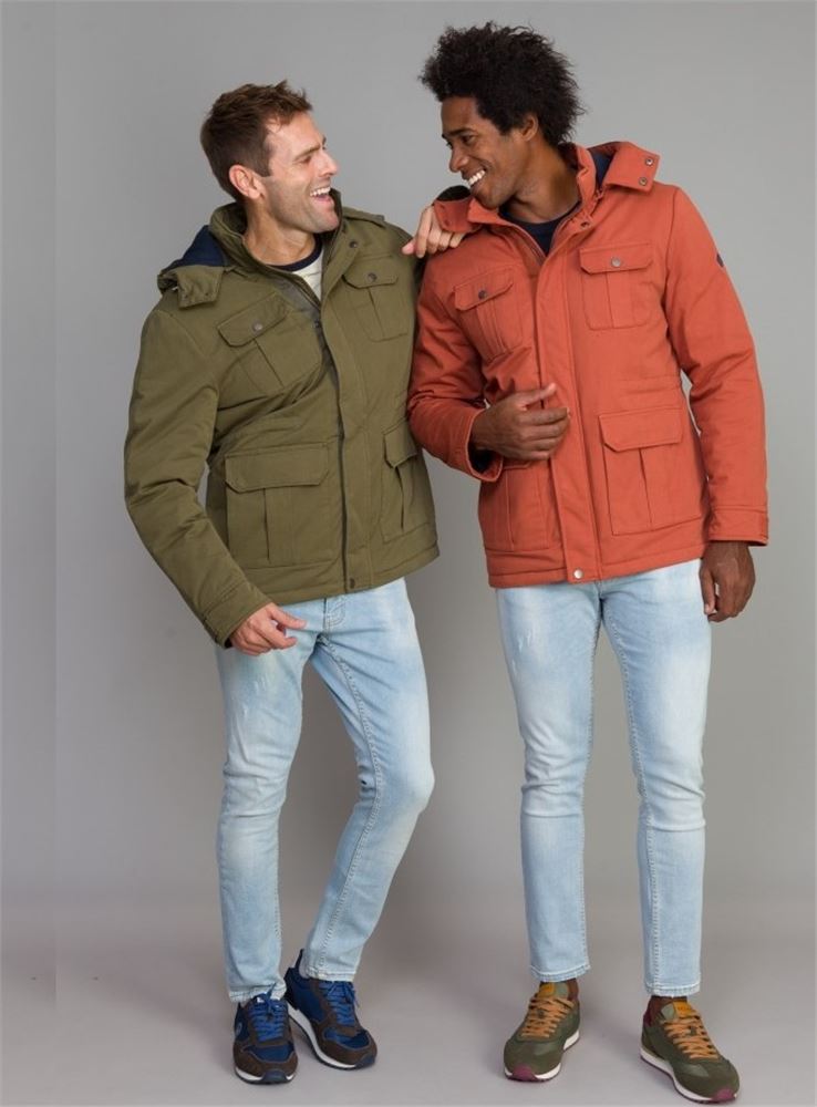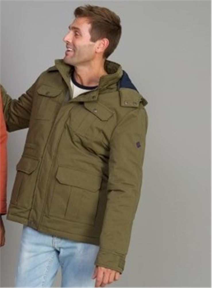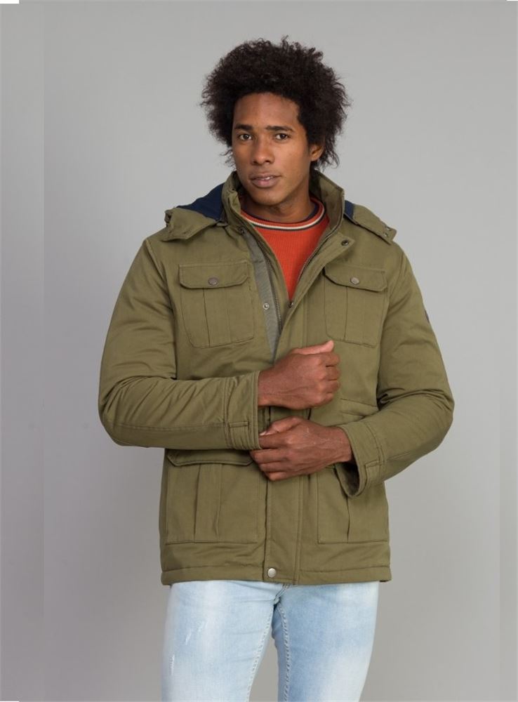 Parka acolchada de pluma sintética en color verde kaki, cuello alto con capucha desmontable y forro a contraste. Bolsillos frontales con tapeta, tanto los de la cintura como los del pecho, éstos con cierre de automatico.