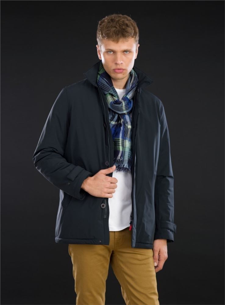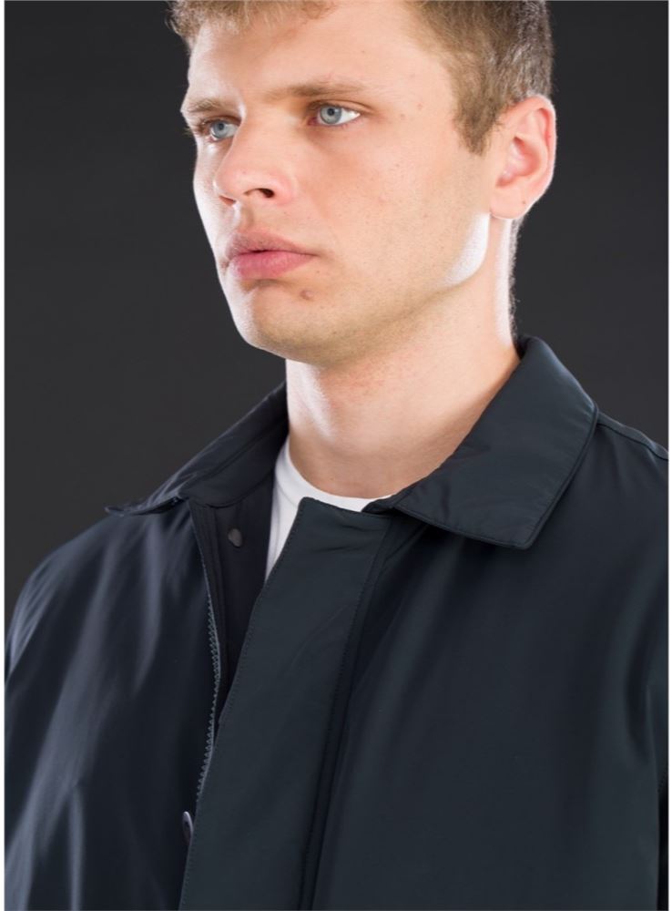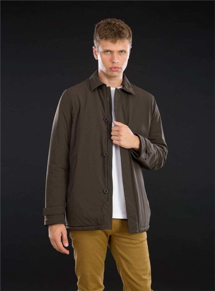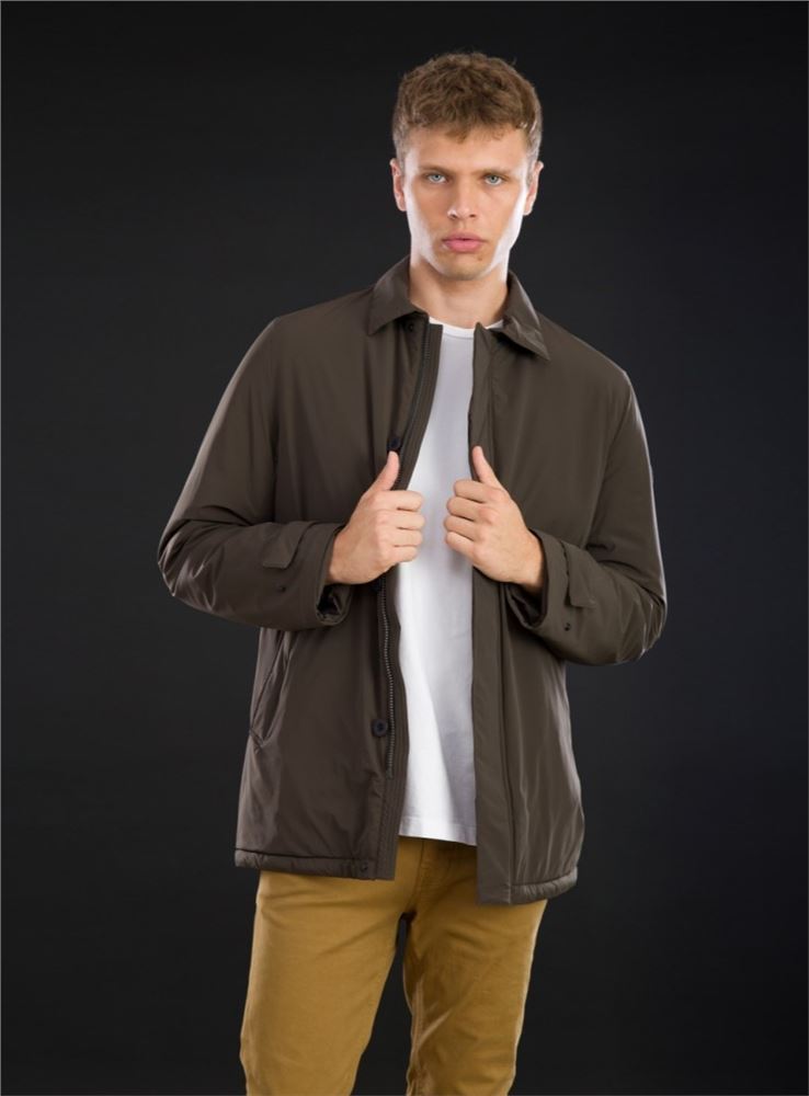 Es una cómoda prenda de estilo, con cuello camisero y cierre de cremallera y botones con solapa antiviento.