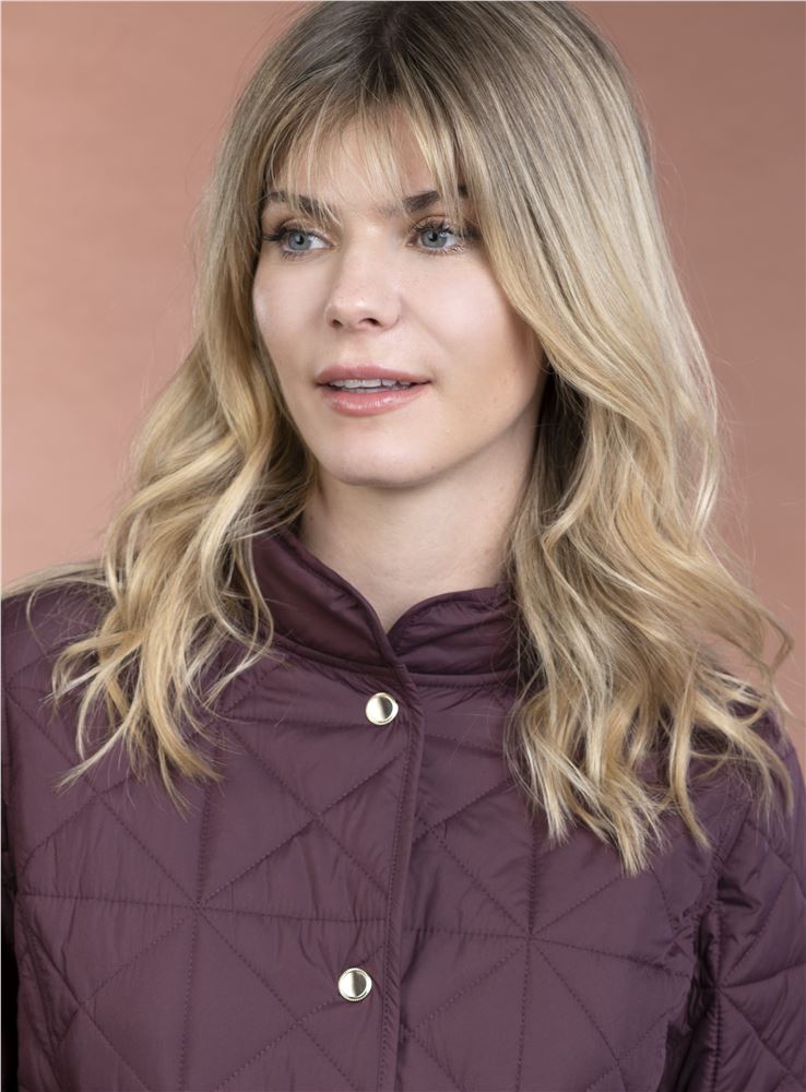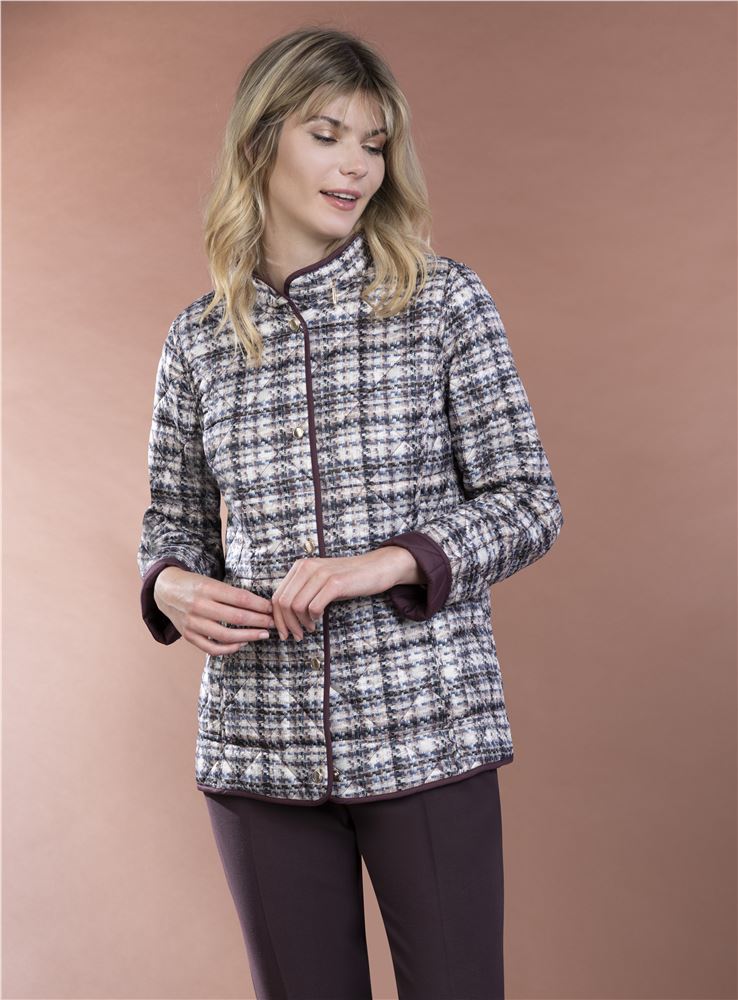 Parka corta reversible con capucha oculta en el cuello. Estampada en dibujo de cuadros con cuello de tirilla y remate en bies en color liso. Segunda cara en color liso.
