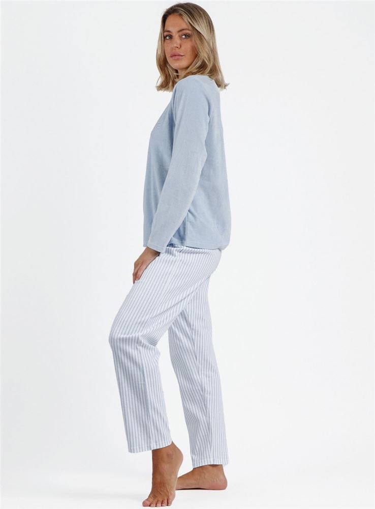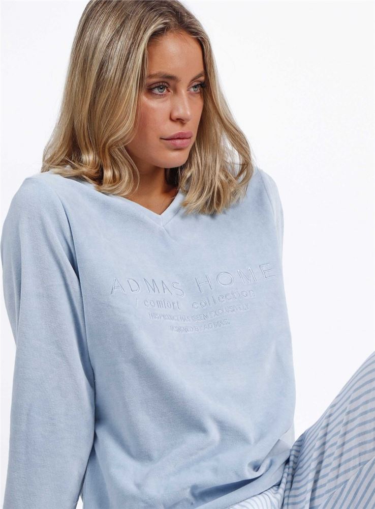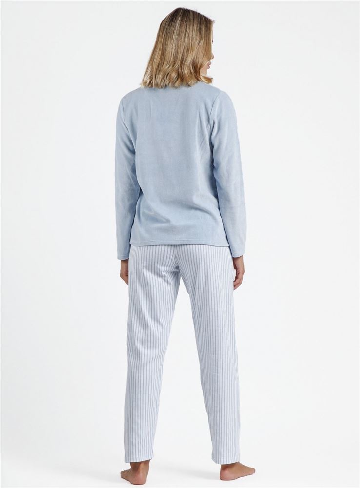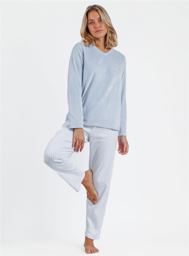 Pijama de invierno para mujer de tejido especial ultraelástico de terciopelo con lycra. Camiseta de manga larga con detalles bordados. Pantalón largo de punto interlock estampado, con cinturilla ajustable.
