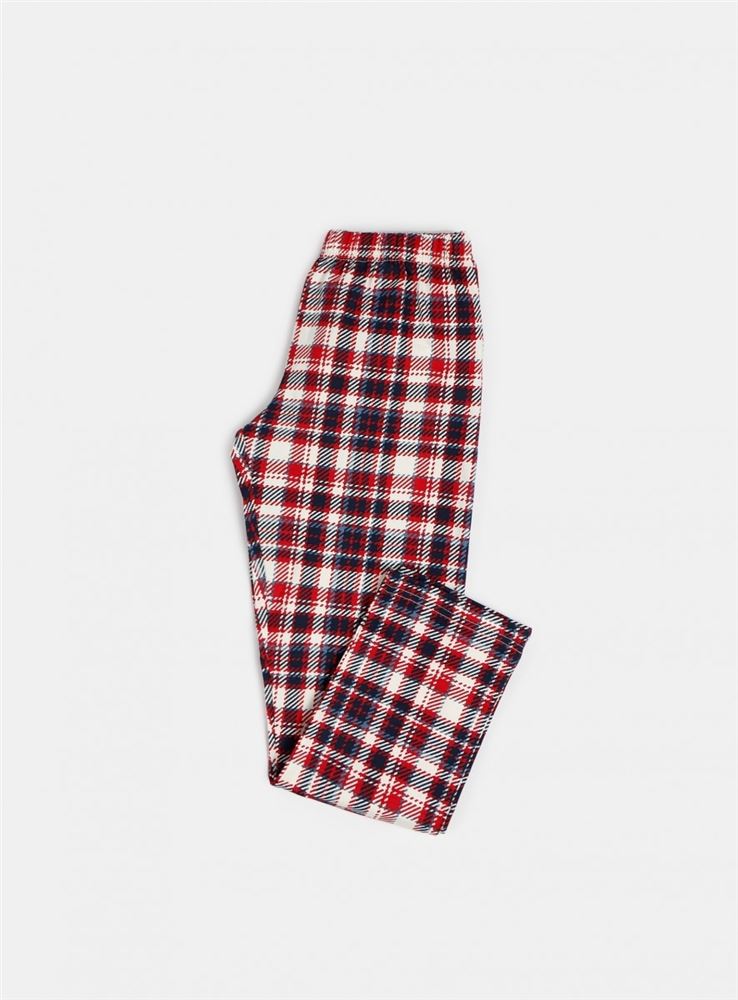 Panlalón estampado de cuadros en colores rojos y azules sobre fondo crudo con cinturilla ajustable