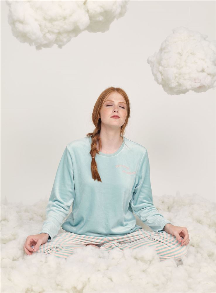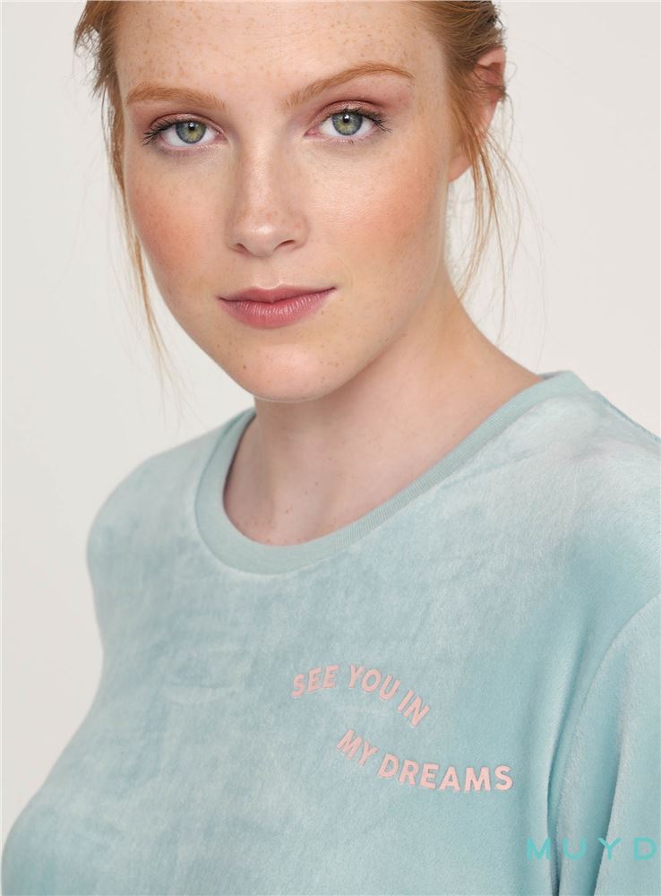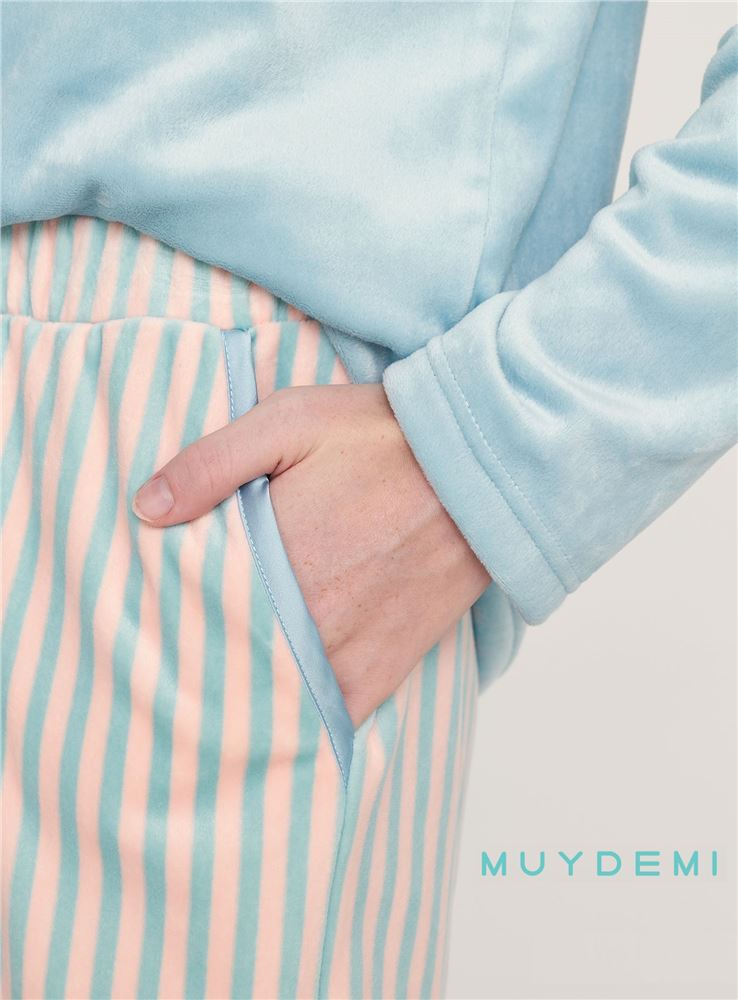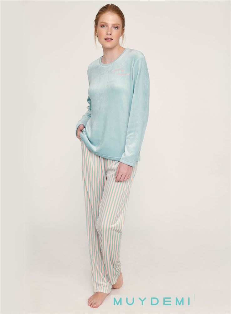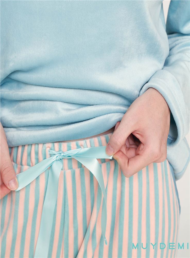 Pijama de señora de diseño exclusivo de la coleccion OTOÑO INVIERNO 23/24, confeccionada por MUYDEMI en cálido tejido de terciopelo con manga larga.