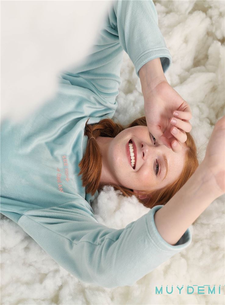 Camiseta de pijama en cálido tejido de microvelour, con fondo liso de color celeste, muy cálido y agradable al tacto, con cuello alto redondo con ribete y slogan bordado.