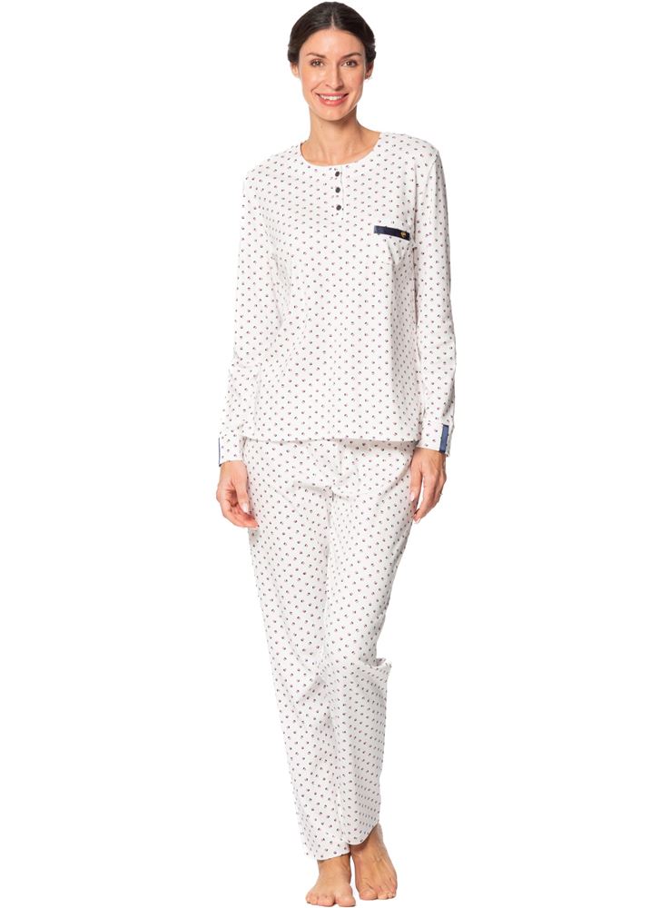 Pijama confeccionado íntegramente en algodón, de manga larga, cuello redondo y pantalón largo.