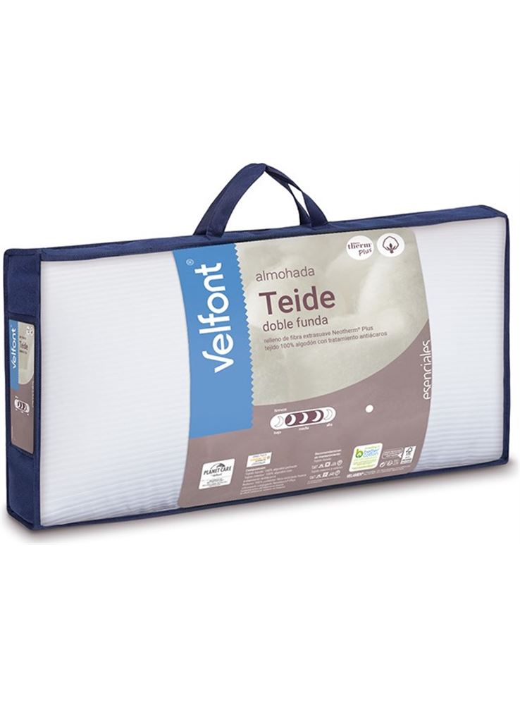 La almohada Teide está confeccionada con relleno de fibra Neotherm® Plus, una exclusiva fibra hueca siliconada y conjugada, extrafina y muy suave al tacto. Es una fibra muy esponjosa que goza de una gran capacidad de recuperación.
