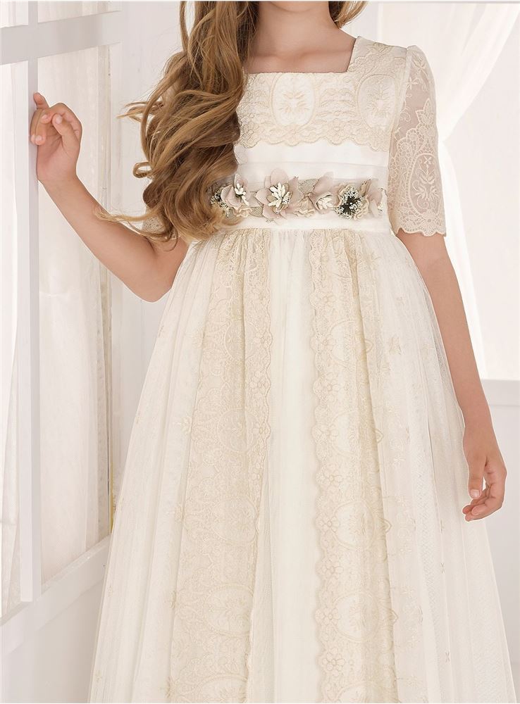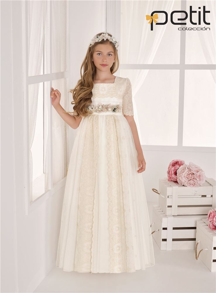 Vestido de comunión de la firma Petit. Vestido de corte romántico. Escote cuadrado por delante y espalda abierta por detrás. Manga francesa, bordada. Fajín de flores. Falda de frunce en gasa combinada con bordados en vertical. Consultar disponibilidad de tallas y colores. Posibilidad de medidas especiales. No se admiten cambios ni devoluciones, para mayor seguridad consultar por teléfono, disponemos de tablas con medidas asociadas a tallas.