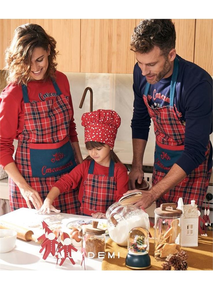 Set de cocina en estampado de cuadros azules sobre fondo rojo compuesto por delantal, manopla y paño acolchado.