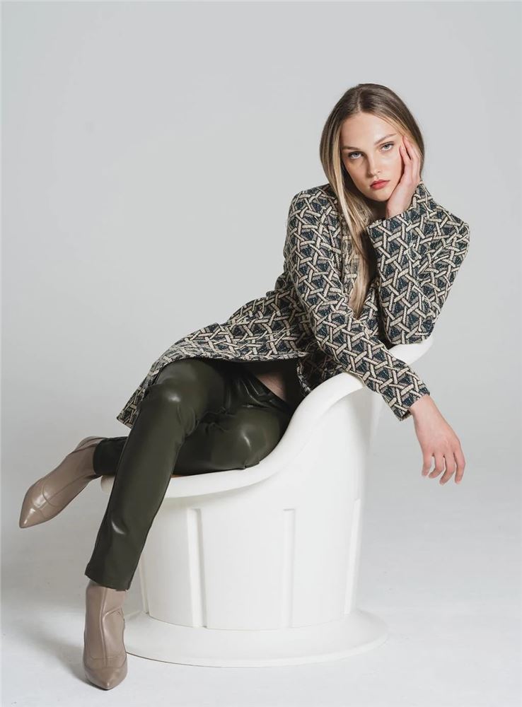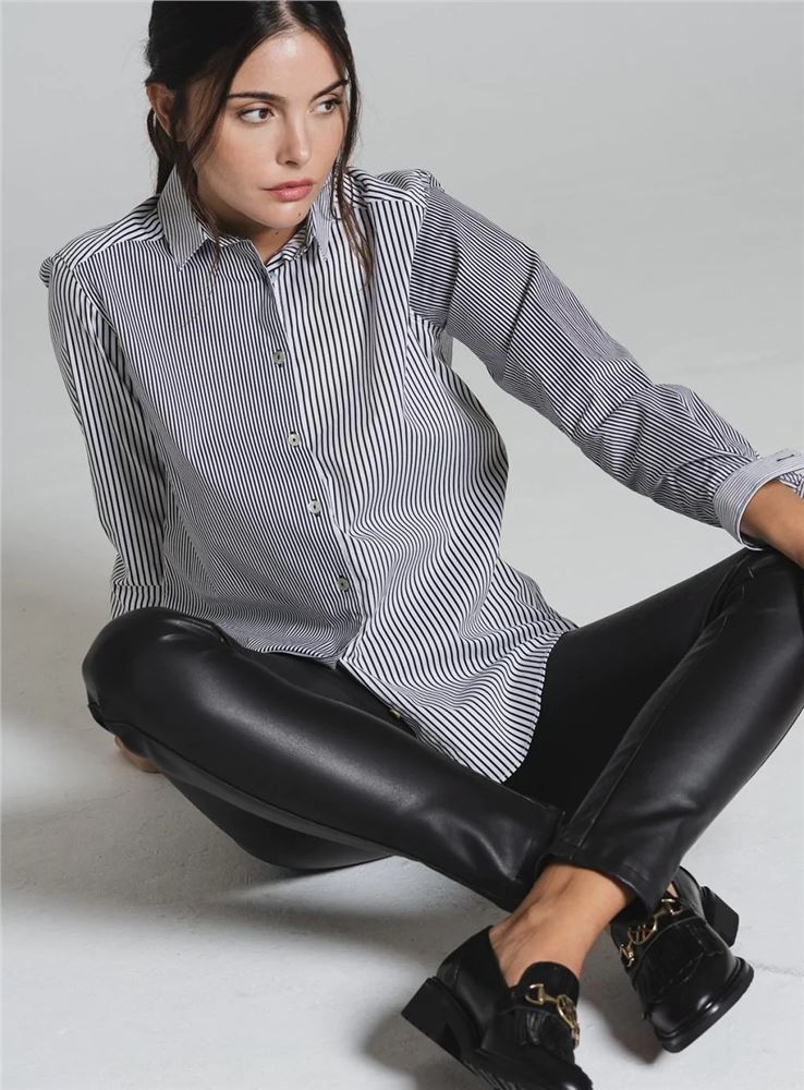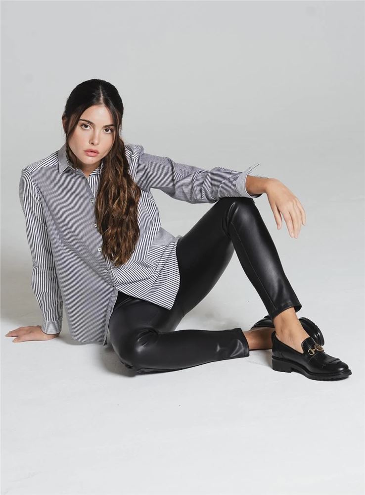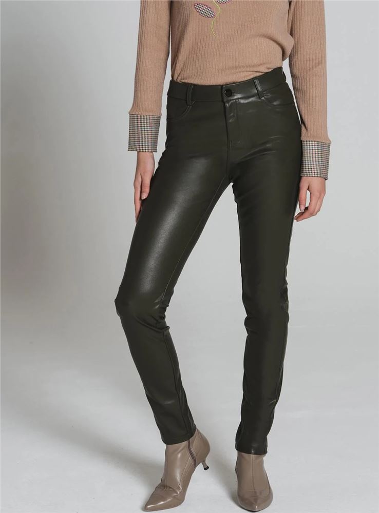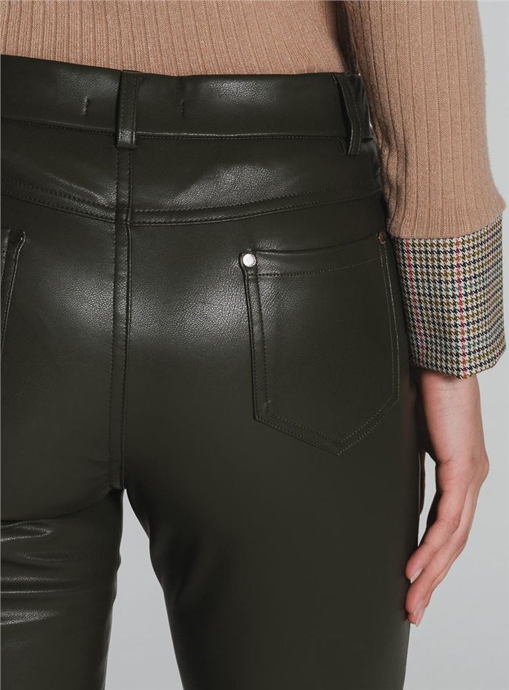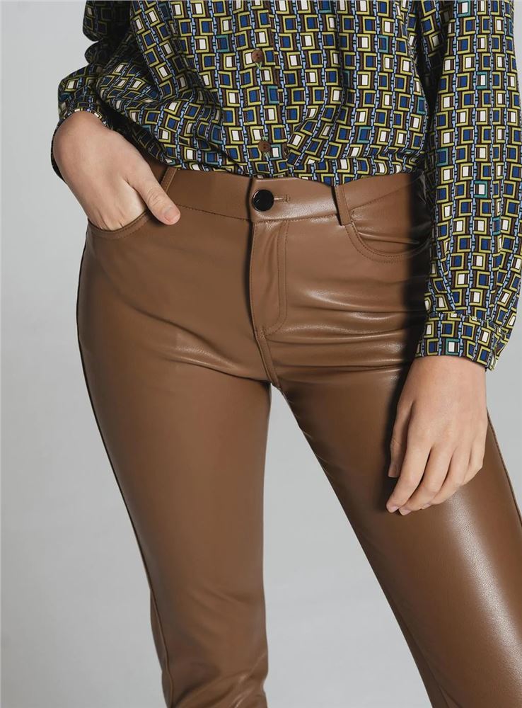 Pantalón skinny polipiel de tiro medio de la firma Tinta Style. Tejido elástico. Cintura con trabillas. Cierre frontal con cremallera oculta y botón. Diseño de cuatro bolsillos.