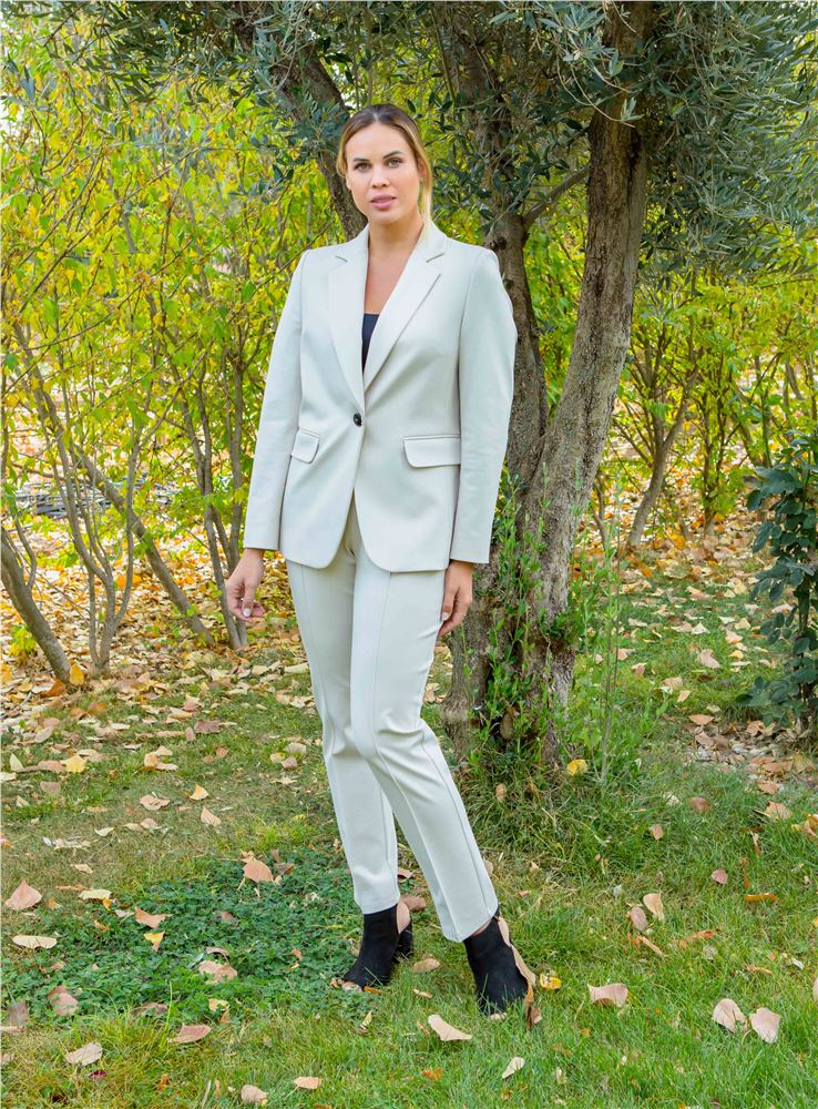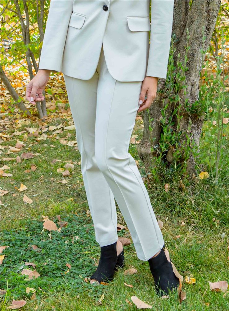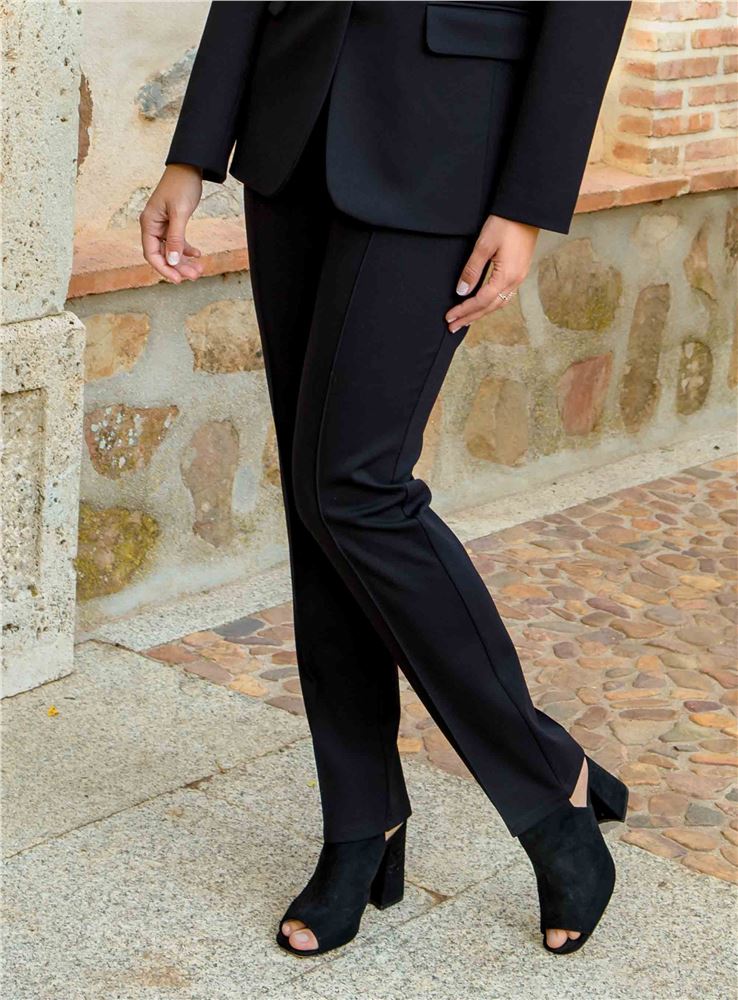 Pantalón de señora de la firma Christina Félix. Tejido en punto roma, elástico y muy adaptable. Cintura alta. Corte recto. Detalle de costura en la pierna. Disponible en crudo y negro. Tiene chaqueta a juego para poder formar traje con el código: SE35112.