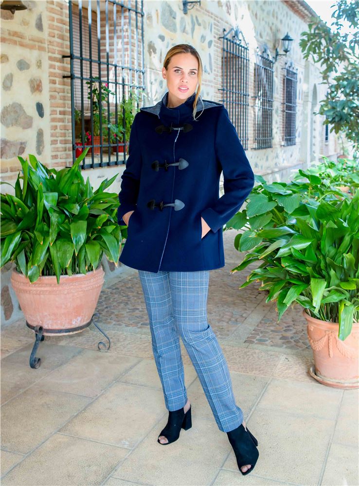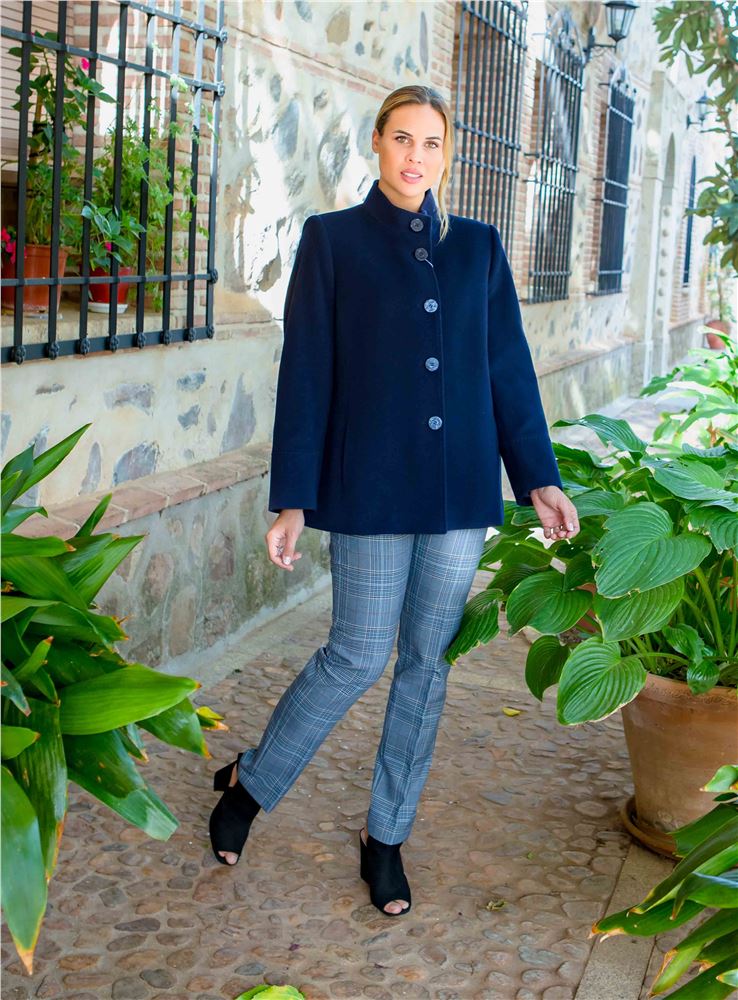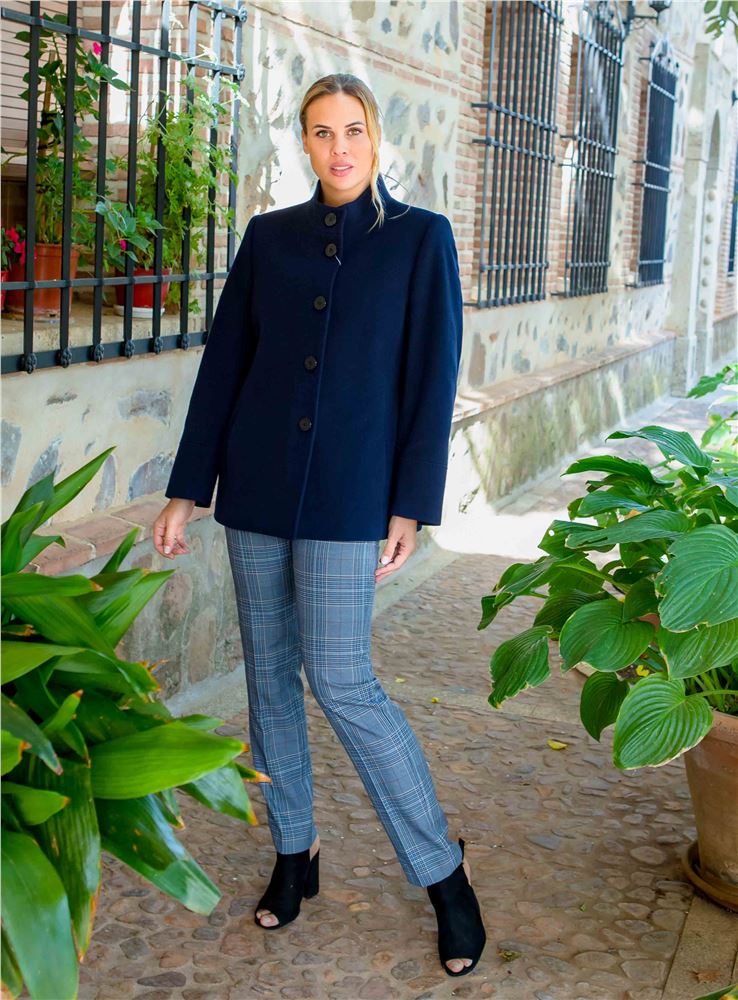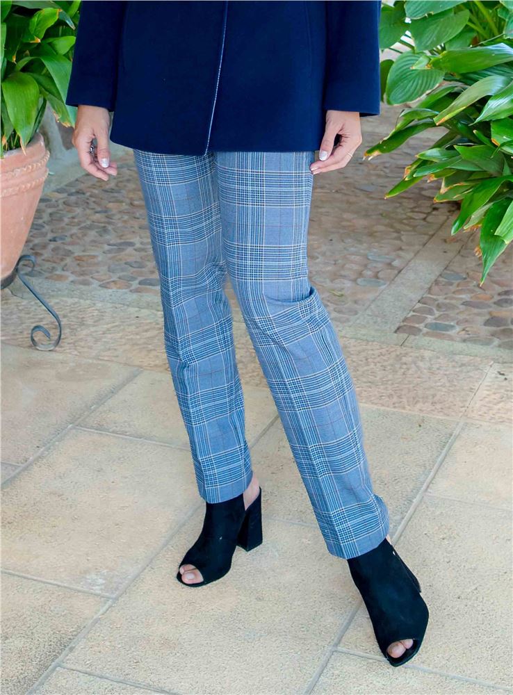 Pantalón de mujer de la firma Christina Félix. Estampado de cuadros en tonos azules. Tiro alto. Cierre con botón y cremallera frontal. Corte recto. Combina con la trenka del código: SE35122.