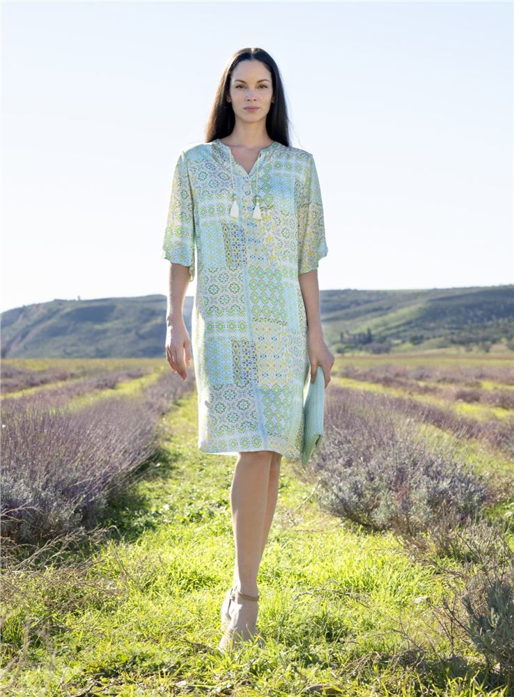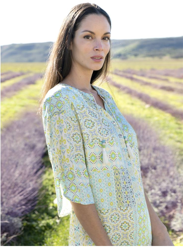 Vestido de cuello a pico y cierre de botonesy cordones con remate en original borla, de manga francesa abierta, confeccionado en tejido estampado con motivos geometricos en colores verdes y azulados.