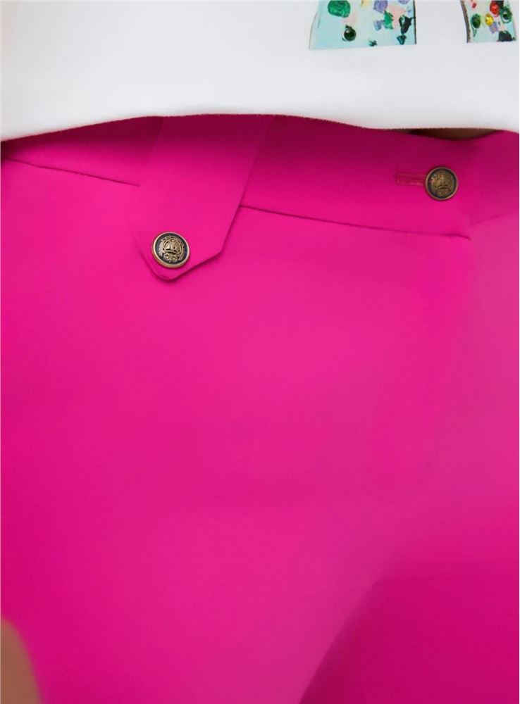 Cintura con trabillas y detalle de elegantes botones decorativos en cierre y travilla. Cierre con botón y cremallera.